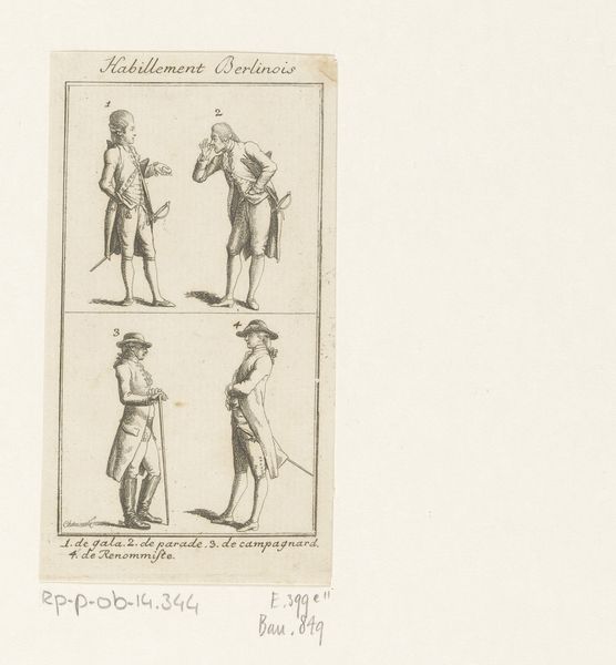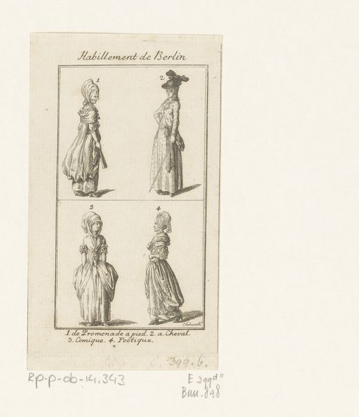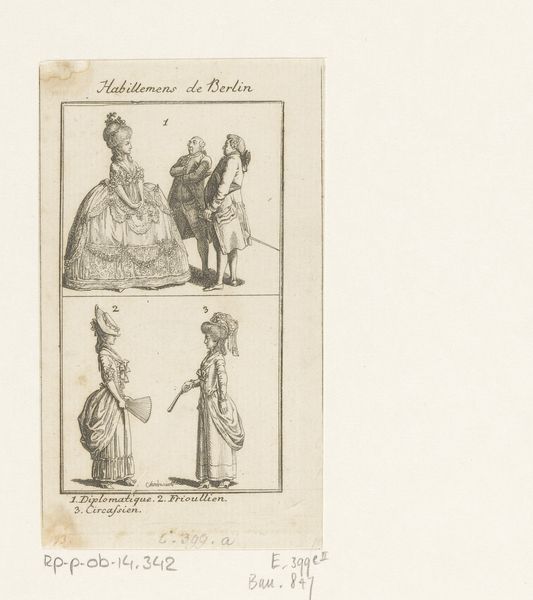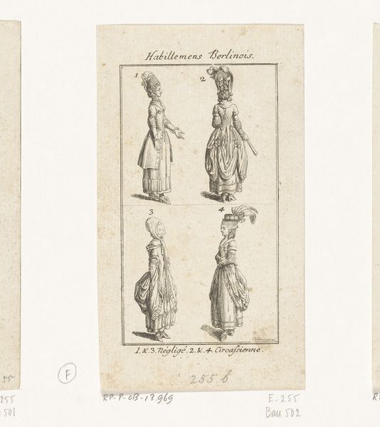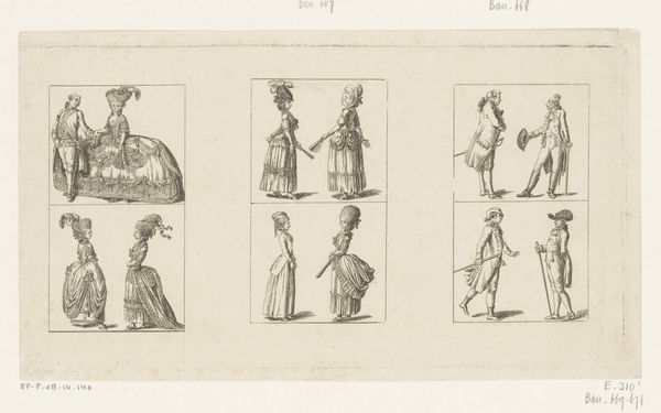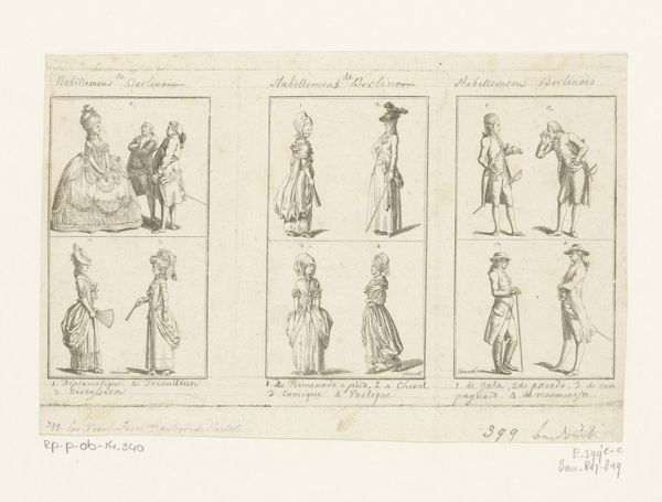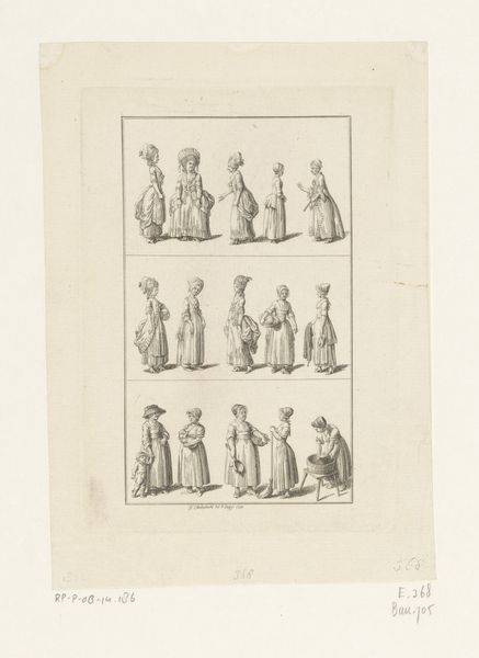 Daniel Nikolaus Chodowiecki made this print of clothing for ladies and gentlemen using etching, a printmaking technique where metal is incised with acid to create an image. Here, line work is the critical element; it establishes silhouettes and conveys surface textures, from lace to linen. Consider all the labor, material, and skill that went into the depicted garments themselves. Clothing in the 1700s wasn’t just about personal expression, but also an indicator of social class. These are the clothes of the bourgeoisie; the artist, also a bourgeois, renders their attire carefully. This print acted as a kind of paper sample book; but more than that, it testifies to the tight relationship between the graphic arts, the fashion system, and the rise of modern consumer culture. It helps us to understand how these clothes, and the social codes they expressed, came into being.