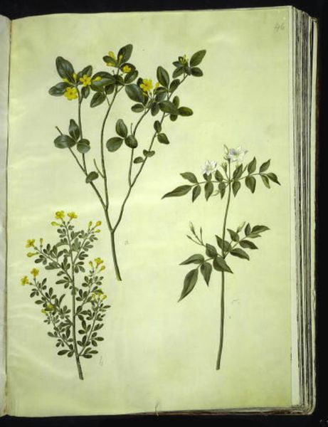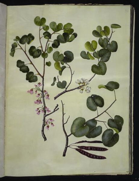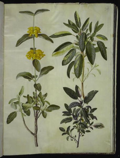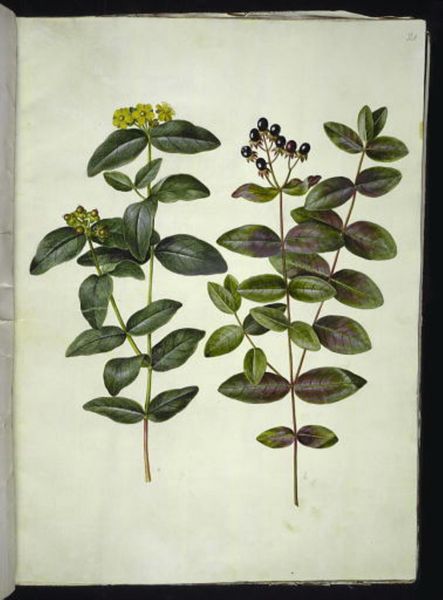 Hans Simon Holtzbecker created this study of Lonicera alpigena and Euonymus europaeus in the 17th century. The composition is structured around two botanical specimens, each meticulously rendered with watercolor on vellum. The artist uses line to carefully define the shape and texture of leaves and branches, evoking a sense of scientific precision and visual clarity. Holtzbecker’s structural approach to natural forms invites a deeper consideration of representation. The directness and the seemingly objective depiction of plants are actually carefully constructed images. We can ask how these images categorize and classify the natural world, reflecting broader systems of knowledge and power. Consider how the artwork presents a vision of nature that is organized and controlled. Holtzbecker's work invites us to examine the artistic and intellectual frameworks we use to understand our relationship with nature. This is not just a botanical illustration; it is a lens through which we can explore the intersection of art, science, and ideology.