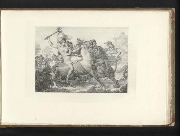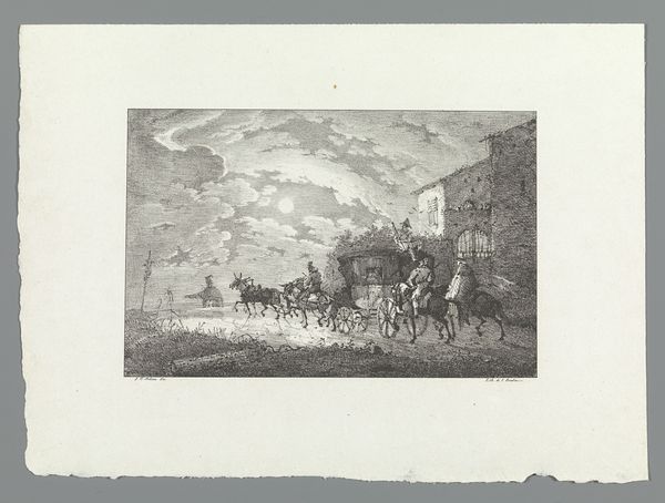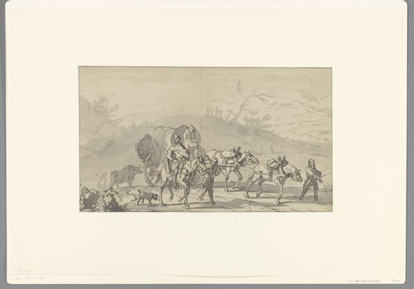 Curator: Before us we have Johann Georg Schinz's "Militairen te paard in de regen," made around 1822. It combines drawing and printmaking techniques, using ink and engraving to depict soldiers on horseback in a landscape setting. Editor: What immediately strikes me is the pervasive gloom. It feels incredibly somber, even a bit oppressive. The texture created by the engraving emphasizes the weight of the rain, and seems to convey a kind of quiet resignation. Curator: Indeed, the artistic skill in rendering such atmospheric conditions through lines and textures is quite masterful. The density of the engraving not only captures the rain but also evokes a sense of historical weightiness, appropriate considering the military theme. Editor: Absolutely. Thinking about the socio-political context, military imagery in this period was so often used as propaganda to bolster nationalist sentiment. This feels very different, though. It is not glorifying war; instead, the rain seems to wash away any potential bravado, reducing the soldiers to figures enduring hardship. Curator: It is tempting to explore it solely through a biographical lens – perhaps considering the artist's experiences – but the image speaks to larger principles of Romanticism: an embrace of emotional intensity and, formally, an attention to stark contrast. The darks aren’t just shading; they symbolize profound inner and external conflicts. Editor: And perhaps speaks to an emerging disenchantment of post-Napoleonic Europe. These soldiers, are they returning, defeated? Or simply on a patrol of no consequence? The ambiguity adds another layer. It is history, yes, but more than just the grand narratives. Curator: Precisely, focusing purely on the subject matter risks overlooking the intricate formalism. The lines, while seemingly representational, function as expressive devices conveying mood above narrative. The composition draws our eyes across the field to these figures. Editor: So, while the history books give us battles and treaties, an image like this offers a visceral, human experience of what it meant to live through a certain time, or after a certain conflict. It reminds us to look beyond the monuments. Curator: Agreed, looking beyond—or deeper within—the pictorial elements shows an orchestration of light, shadow, and texture. These soldiers might fade into historical obscurity, but this work etches a resonant image into our understanding of romantic expression.