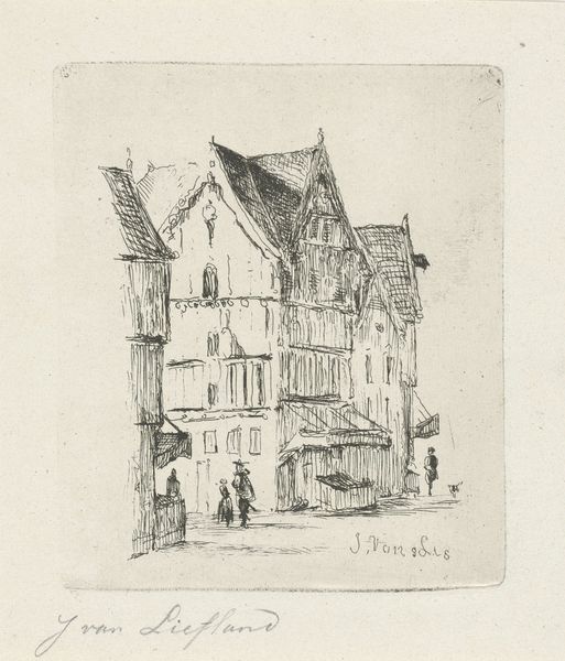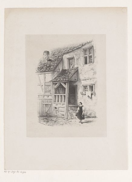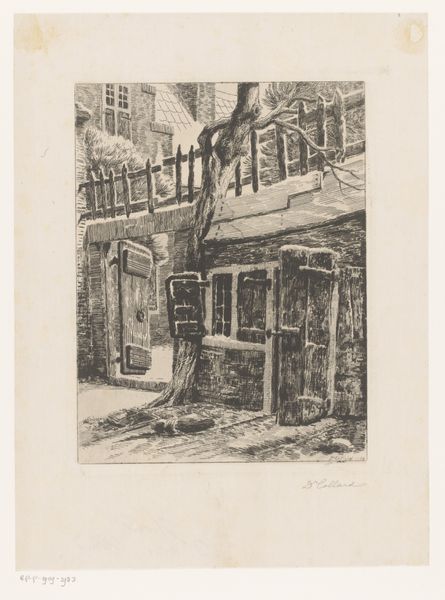 Editor: This etching, "Huis met schuin kelderluik in Veere," or "House with Slanting Cellar Hatch in Veere," created sometime between 1881 and 1913 by Lucie van Dam van Isselt, offers a delicate depiction of a house in Veere. The narrow, vertically-oriented format lends an almost claustrophobic feeling. What draws your eye when you look at it? Curator: Ah, Lucie, she was so observant. The image is fascinating because of how it both hides and reveals itself. At first glance, it’s a simple building portrait, a moment captured in the Dutch city, Veere. But I can almost feel the breath of history whispering from those aged walls. There’s a quiet humility about it. Doesn't the light seem to catch on something ephemeral, something we almost can't name? Perhaps, nostalgia? Editor: Nostalgia... I can see that. The detail in the windowpanes is captivating and definitely has that sense of an old world, with lots of stories to tell. Tell me more about how you connect that to Van Dam van Isselt? Curator: Well, there's such an intimacy here. Lucie was not simply copying what she saw. This almost ethereal softness within an image filled with structure makes me imagine her gently holding a memory, a personal resonance that slipped from the outside world onto the plate. It is almost like looking through a veil, blurring what's real and what isn’t. Is it just me, or is there also humor? That slanting cellar door seems a little... defiant, maybe? Editor: Defiant! I hadn't considered that. Now, that does strike me as unique to this work; everything else is so... ordered, almost regimented. Maybe that door is like a little rebellion of the mundane. Curator: Exactly. A playful refusal to conform perfectly. Van Dam van Isselt reminds me to never just observe but truly see what whispers just beneath. I am really grateful you made me see that a simple etching can say so much. Editor: Likewise. This was eye-opening in appreciating subtle details, thank you!