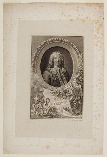 Curator: Here we have Étienne Ficquet's portrait of Pierre Corneille. The dimensions of the image are about 14 by 9 centimeters. What do you make of it? Editor: Intricate, certainly. The cherub and the eagle give it a flair, and the laurel wreath around Corneille’s portrait suggests accomplishment. Curator: Absolutely. Ficquet was a master of engraving, and you can see that in the fine lines and details. The materiality of the print itself - the paper, the ink - speaks to a specific mode of artistic production and consumption in its time. Editor: Right, but I think the artist’s vision is what matters most. The composition, the way the light falls on Corneille's face… it's all quite striking. It conveys a certain gravitas. Curator: Gravitas, yes, but also status. The print was likely made for distribution, contributing to Corneille's public image and the broader cultural economy surrounding literary figures. Editor: I still believe that there's something incredibly affecting and beautiful, the engraver has captured the depth of the human spirit, regardless of those social functions. Curator: A balance, then, of method and emotion. Editor: Precisely. A harmonious blend!