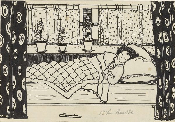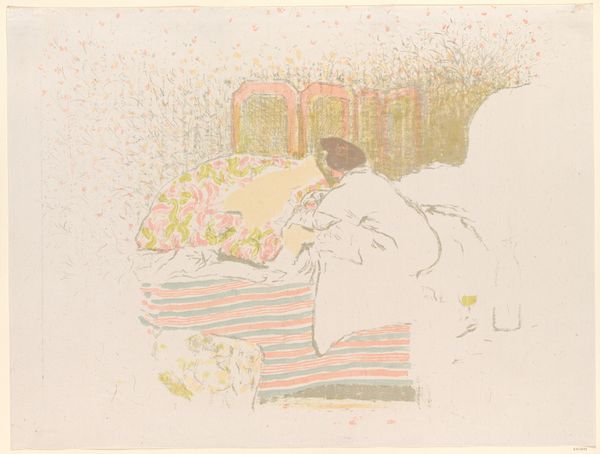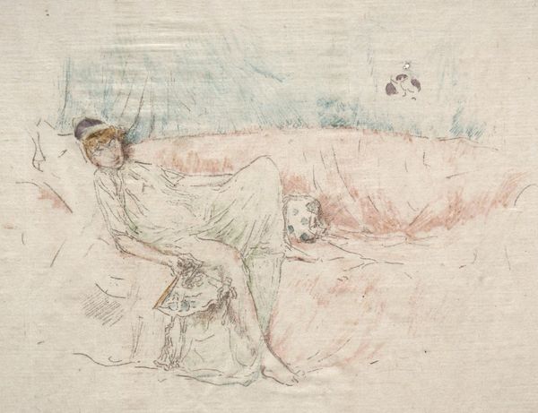 Editor: Here we have Vuillard’s "La naissance d’Annette," created around 1896-1900. It appears to be an etching with some watercolor elements. The composition feels very intimate and domestic. What do you see in this piece, especially concerning the materials he employed? Curator: This image really showcases Vuillard’s focus on the intimate details of bourgeois life, but let's think about his methods. Etching, traditionally considered reproductive, becomes something else in his hands, almost unique, mimicking the immediacy of drawing. Consider the textures achieved through layering of watercolor over etching – the material application suggests the dense interior spaces and cluttered domesticity of his subjects. How do you think the choices of printmaking influences his statement? Editor: I hadn’t considered the deliberate blending of what some might call 'high' and 'low' art forms, but using printmaking to mimic drawing introduces the idea of reproducibility into an intimate scene, which is definitely intriguing. It makes me think about how labor impacts the work, the time spent creating a printed image versus painting. Does it change the meaning for you? Curator: Exactly! Vuillard challenges hierarchies. The etching process, historically linked to mass production, is here employed for something delicate and personal. Consider the materiality of the paper itself, likely chosen for its absorbent qualities to enhance the watercolor washes, emphasizing flatness, questioning the traditional artistic materials to highlight the artist's process, almost a 'behind-the-scenes' look at creation. Editor: I never really looked at it that way, as process so deliberately guiding how to experience the image, and almost more interesting than the figures. Thank you! Curator: And thank you – by recognizing the material elements, we bring attention to how the artwork exists in a specific time and place, reflecting industrial capabilities.