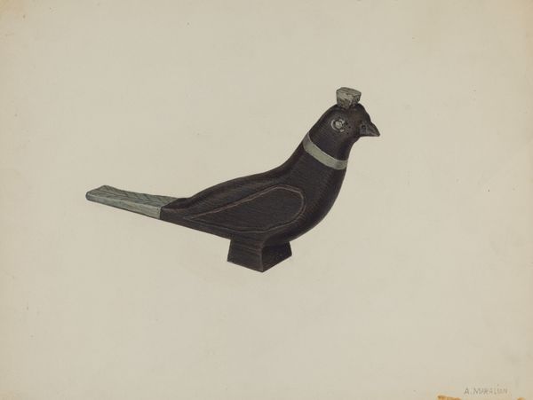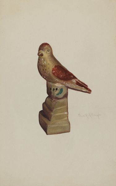 Curator: The melancholy of this piece really strikes me. This rendering of a Pa. German Toy Bird by Charles Garjian, dated around 1939, whispers of simpler times, maybe even forgotten joys. What do you think? Editor: It has the kind of flatness associated with folk art, or rather the deliberate techniques employed to mimic it. What's most interesting to me is the choice of watercolour and the implication of accessibility of the tools; readily available pigments, easily portable. It speaks to a democratic notion of art-making, doesn’t it? Curator: Absolutely, it hums with a humility that draws you in. I love the way Garjian uses watercolour; it's almost as though he's revealing the bird’s interior landscape with those strokes. The exposed innards are kind of grotesque, but with whimsy. There’s real vulnerability there. It feels like holding a fragile memory. Editor: The deliberate naivety you're sensing is crucial, but for me, it’s not so much about inherent vulnerability. It seems more tied to an appropriation of craft traditions and techniques. There's an interesting tension at play with a “toy” also referencing ideas around commodification and production, doesn’t it? Curator: It does! It also reminds me how something made simply—for play, even—can carry profound meaning. The colour choices feel almost symbolic, like they’re holding a secret language. Is there a certain kind of "realness" gained by taking up something deliberately flattened like folk art? Editor: Yes, and how its apparent artlessness allows an audience in precisely through what it rejects—or never had to begin with—in terms of "academic" modes of rendering. I keep coming back to watercolour—the decision to embrace a medium that resists polish and grandiosity. It speaks of resourcefulness but also a certain ethos about artmaking that, yes, challenges the supposed divide between high art and, well, not high art. Curator: It certainly brings a fresh perspective to ideas about craft. Thinking about it, this small watercolour isn’t just an image, it’s an experience, inviting a dialogue between us and the past, no? Editor: A carefully constructed experience—where every visible brushstroke and chosen medium makes its own compelling argument about production and what constitutes the work itself.