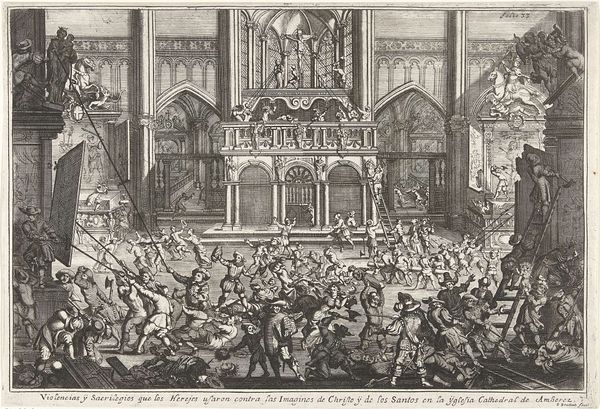 Editor: This is a print by Étienne Dupérac, titled *Speculum Romanae Magnificentiae: Marriage of Annibale Altemps and Ortensia Borromeo, Rome, March 5, 1565,* made in 1565. The detail is incredible! It looks like a snapshot of a massive celebration, rendered with such precise lines. I’m curious, as someone immersed in the visual language of history, what do you see in this piece? Curator: This isn’t just a record of a wedding; it’s a deliberate construction of power and status, isn’t it? The very perspective, forced and exaggerated, makes the Altemps-Borromeo union monumental. Think about the architecture – cold, rational. What emotional feeling do these geometric elements project onto the overall impression, do you think? Editor: The symmetry and order definitely communicate power, like a stage set for a demonstration of wealth. The eye is drawn to the center, emphasizing the performance more than the people involved. Curator: Exactly. Now, consider the specific symbolic language embedded. We have militaristic imagery– lines of soldiers and knights clashing in joust. How might these classical militaristic figures reflect broader cultural currents? Consider its intended 16th century audience and their common social experiences. Editor: I see. The soldiers, the formations... perhaps they reflect not just military strength, but the controlled social order the families wished to project. And I’m just realizing, marriage itself was a strategic maneuver, less about love, more about consolidating influence. Curator: Precisely! It reminds us how imagery can solidify lasting beliefs about a ruling class. Even seemingly innocuous celebratory art can carry weight with lasting impacts over the collective cultural memory of this era. The event’s details now take on layers of intention beyond just documentation, don’t they? Editor: Absolutely. It makes me reconsider how art commemorates, celebrates, and consciously crafts meaning. It is power expressed visually! Curator: Yes, indeed. This is how echoes of that power continues to ripple through time. It makes you realize how a print of a party has cultural consequence.