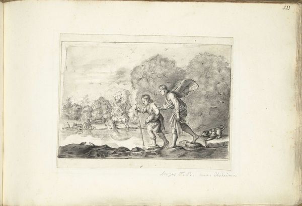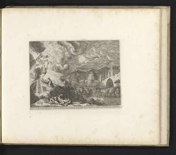 Curator: This is Laurent Cars' "The Baggage Train." Editor: The immediate impression is one of respite amid toil. The composition draws the eye from the foreground idyll to the bustling background. Curator: Indeed. Consider the baggage train in its historical context—it speaks volumes about the lives of those who followed armies, often women and children, essential yet marginalized. Their stories are etched into this landscape of conflict. Editor: The etching technique itself is remarkable. Note how Cars uses line variation to create depth and texture. The smoke, for instance, is rendered with such delicate strokes that it appears almost ethereal. Curator: Precisely! And isn't it telling that the figures in the foreground seem oblivious to the labor behind them? It provokes questions about privilege and the unseen costs of societal structures. Editor: It's a complex image, masterfully executed and full of visual and social tensions. Curator: A reminder that even seemingly pastoral scenes carry layers of socio-political meaning.
