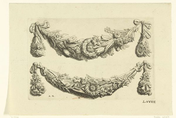 Editor: Here we have "Festoen met een granaatappel in het midden," or Festoon with a Pomegranate in the Middle, a print by Francoys Dancx, made before 1677. The crisp lines forming this garland give it a really formal feel. What’s your take on this from a historical perspective? Curator: This print offers us a fascinating window into the social function of art during the Baroque period. The precision of the engraving elevates what might seem a simple decoration into a status symbol. Editor: Status symbol? How so? Curator: Think about the cost of commissioning such a piece. It demonstrates wealth and taste, aligning the owner with ideals of beauty and refinement that were being actively promoted by powerful institutions. How would a print like this have been used? Editor: Perhaps to decorate a home, showing off wealth, as you said? Curator: Exactly. It speaks to the increasing importance of visual culture and how art served as a marker of social standing. It would also serve as source for other artists when creating large scale decorations. It's more than just a pretty picture; it's evidence of a carefully constructed cultural landscape. Editor: I hadn’t considered the social aspect so directly. It’s like a visual representation of power. Curator: Precisely. The very act of displaying such an image becomes a form of cultural capital. Hopefully that helped broaden how you view prints, as so much more than images on paper. Editor: Absolutely. Now I see the print itself as an artefact deeply embedded in its time. Thank you.