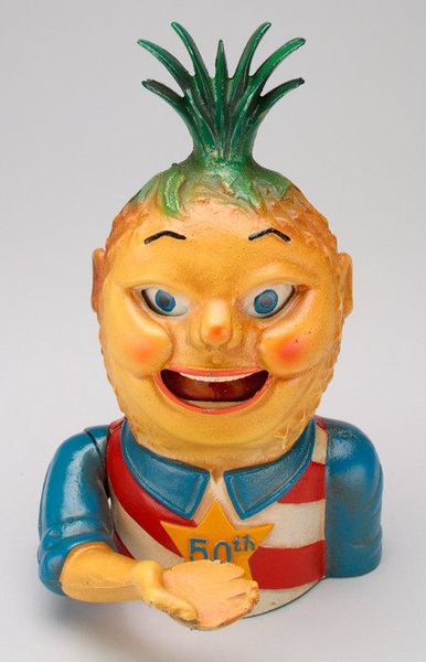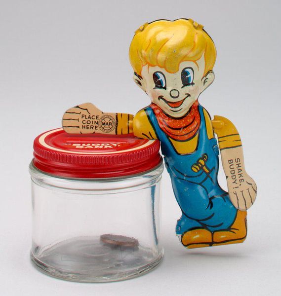 This -Roly-Poly Monkey- still bank at the Minneapolis Institute of Art, made by J. Chein & Company, uses bright colors and simple shapes to create a playful design, reflecting an understanding of artmaking as a process of simplification and joy. The piece uses lithographed tin to produce an image of this grinning monkey, which has an interesting tactile quality. The bright orange and yellow hues create a sense of warmth and cheerfulness. Look closely at the monkey's face; you can almost feel the texture of the fur, created with delicate linework. The stripes on the base, though simple, add a dynamic rhythm to the overall composition. This piece reminds me of the kind of folk art that feels both familiar and wonderfully strange, like something you might find in a dream. It also speaks to the ongoing conversation in art about how we represent the world around us, often transforming the ordinary into something extraordinary. It’s a reminder that art doesn’t always have to be serious, it can be playful, whimsical, and open to interpretation.
