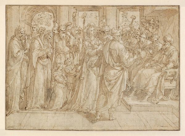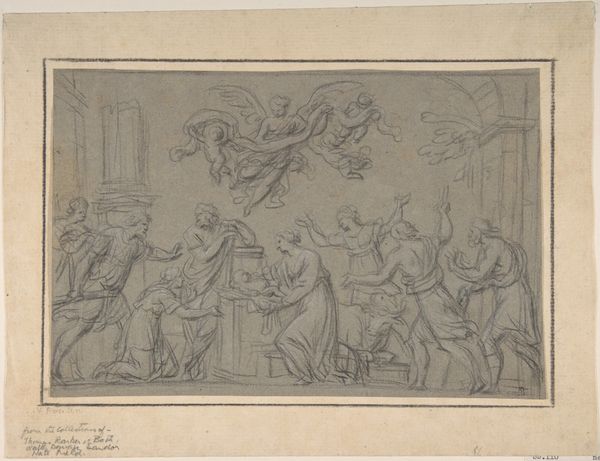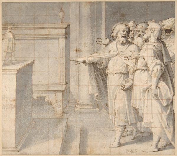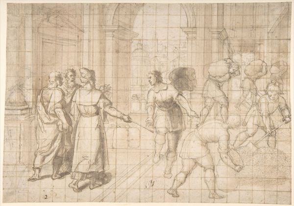 Editor: So, here we have "The Coronation of Esther by Ahasuerus," a drawing by Bartolomé Carducho created sometime between 1560 and 1638. The figures are rendered with such delicacy; however, the overlaid grid disrupts that sense of lightness. How do you interpret this work, especially considering its historical and cultural context? Curator: The grid is definitely a crucial entry point. Doesn't it highlight the preparatory nature of the sketch? We’re looking at the planning stages of a painting, an almost mathematical approach to visualizing power, both divinely sanctioned and politically enacted. Consider, for example, the story of Esther, a Jewish woman becoming queen in Persia, potentially saving her people. What tensions are at play here? Editor: That’s interesting. The coronation could signify both a moment of great triumph, as well as the patriarchal constraints placed on Esther, or even the complicated interplay between faith and political power. I wonder, how might contemporary theory inform our reading of it? Curator: Exactly. Can we see Esther as a figure navigating and even subverting the power structures around her? Are there parallels to be drawn between Esther's story and, say, intersectional struggles for recognition and representation today? Where do you see this artwork situated within gender and racial narratives? Editor: I suppose that by analyzing the depiction of Esther, specifically how she's kneeling submissively, we might actually interpret that posture not just as submissive, but potentially strategic. Perhaps this is her way of gaining power within this system. Thank you, this has reshaped my perspective entirely! Curator: And seeing it through a modern, critical lens, hopefully, grants us richer insights into both the artwork and ourselves. It's a conversation between then and now.