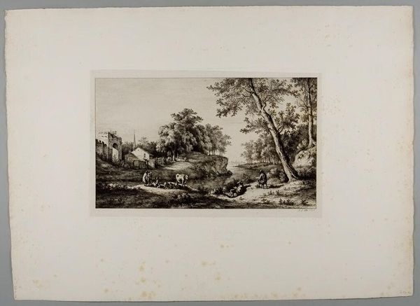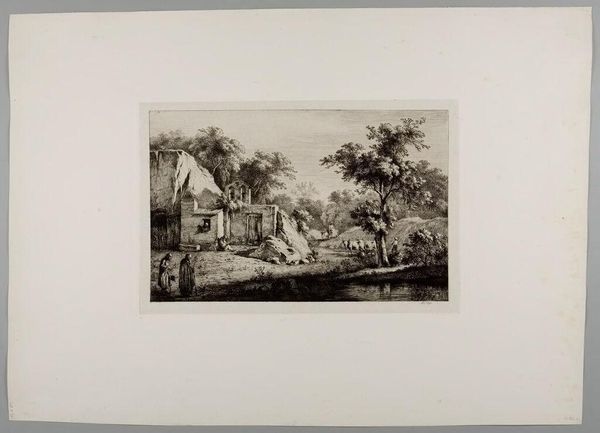 Curator: This is Jean Jacques de Boissieu's "Mill with Two Draughtsmen on the Right," a detailed etching from the 18th century, presently held at the Harvard Art Museums. Editor: I am struck by the dichotomy of the tranquil scene and the turbulent water; it is a calm chaos in a way. Curator: Indeed! The mill, often a symbol of industry and progress, stands in contrast to the raw, untamed power of the water. Consider how the two draughtsmen frame that tension, perhaps intending to capture the essence of this industrial-natural interaction. Editor: And the draughtsmen themselves! Their presence is intriguing. They are not merely documenting; their act of observing transforms the landscape into a subject of intellectual and aesthetic pursuit. Curator: Their placement implies a kind of ownership or even control over the landscape, fitting within the Enlightenment's fascination with reason applied to the natural world. Editor: It's like a captured moment, but it transcends a simple snapshot, representing the relationship between humanity and nature during that era.