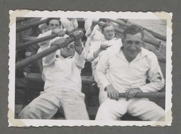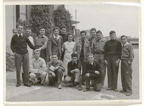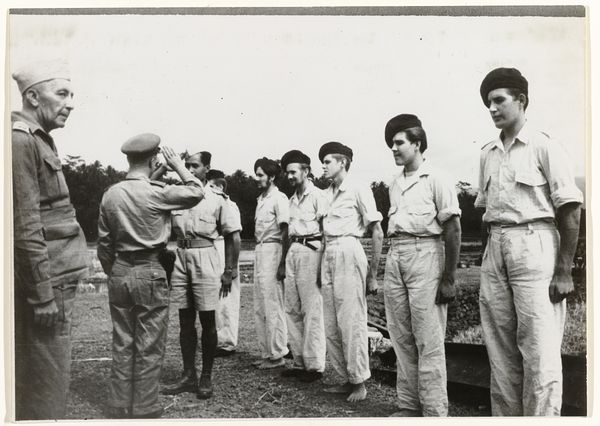 Editor: This photograph, a gelatin-silver print titled "Militairen in afwachting van keuring," meaning "Soldiers awaiting inspection", was taken anonymously sometime between 1941 and 1945. There's something about the waiting that feels so heavy here, a kind of anticipatory stillness. It's interesting that they're not posed, almost like we caught a glimpse of them unaware. What catches your eye, or what do you see happening beyond the surface? Curator: It's the ambiguity, isn't it? The space between 'action' is always so fertile. I see a study in shared tension, mirrored in their postures. Anonymous as it is, I bet you anything the photographer was one of them – capturing that liminal space between individual and cog-in-the-machine. Does that border look jagged to you? Almost violently torn? It speaks volumes, unintentionally or otherwise. It whispers about the abrupt ruptures they were about to experience. How do *you* think it speaks to ideas of realism or portraiture in that moment? Editor: The torn edges give a sense of urgency to an otherwise still and quite composed scene. Also, that little kid standing between the soldiers -- what's that about? Is that normal for that time and place? Curator: Normal, perhaps not, but resonant? Absolutely! Maybe he is an anchor in the present, innocently outside of it all – highlighting the tragic loss of it. Perhaps the photographer hoped to capture innocence juxtaposed with imminent loss of it. If they all made it through the war that is! The photograph makes one want to dream up scenarios and potential storylines. The most captivating photographs often possess a dreamlike quality that encourages reflection. Editor: I like your view that it serves as a reminder of innocence or maybe childhood before they became 'soldiers.' It sounds plausible. This quick chat shifted my view entirely – what initially seemed like a casual group photo now feels like a loaded observation about identity and disruption. Curator: Precisely! It is a powerful testament of wartime impact, even from an anonymous lens. Perhaps the greatest insights lie within those images devoid of a known authorship.