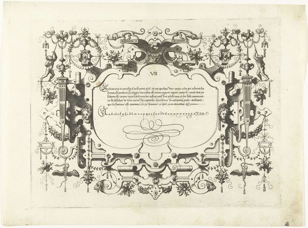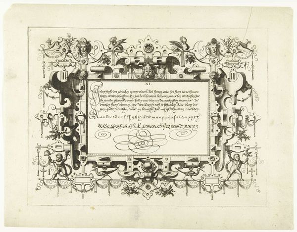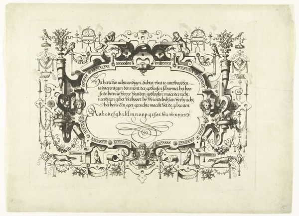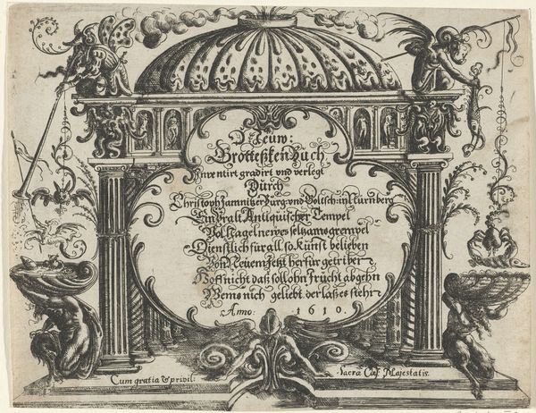 Curator: Allow me to introduce "Titelpagina voor Lucas Fopsz Lely, Jeughts nutlijck A.B.C.," created in 1621 by Gerrit Gauw. It's a beautiful example of Baroque engraving. Editor: Baroque, yes, but also so…packed. Like a little visual encyclopedia, teeming with characters and cityscapes, all crammed together. My first thought is, wow, this artist really wanted to get their money's worth! Curator: It's a title page, after all, so it serves as a sort of advertisement. Note how it frames Lucas Fopsz Lely's name within emblematic city views of Amsterdam and Hoorn. The cities act as testaments of reputation, announcing its geographical reach across Holland. Editor: Oh, so it's like a visual CV! Clever. The Amsterdam side, especially, looks so lively with those little boats on the water. I also love how the seated figures with books are mirrored, balanced by the garland draped underneath. The caduceus gives an almost "medical" feeling, and the contrast between the figures in motion versus those engrossed in study is very interesting. Curator: Indeed! And the caduceus may be a sign that he studied abroad, or at the very least it alludes to intellectual wealth. These carefully constructed scenes are visual arguments for the school's merits: commerce and classical erudition made newly accessible in the vernacular Dutch. Editor: You're right, those cityscapes really root it in a specific time and place, and highlight the significance of local language in this historical moment. I bet people recognized the skyline of Amsterdam immediately back then. That level of detail in an engraving! Amazing. Curator: It emphasizes that while rooted in Amsterdam’s prosperity, this educational mission expands outward. Note, finally, the artist's tiny signature bottom-left— a statement of pride and accomplishment, as much as a declaration of authorship. Editor: Yes! The engraving style is incredible; I love these details and how they contribute to the composition, while remaining in the periphery, giving us clues. Thank you, it made me see the work in another way. Curator: The pleasure was all mine! Each element sings in concert when one tunes their attention appropriately.