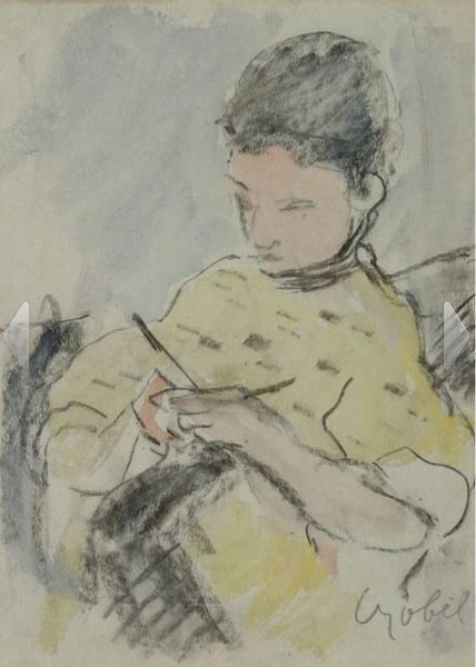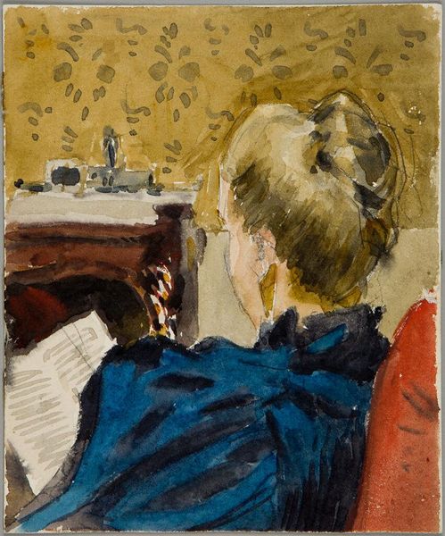 Curator: Oleg Holosiy painted "Tanya. XX Century" in 1989, using oil on canvas. It’s a genre painting with portrait elements. Editor: There's a captivating sense of quiet melancholy, wouldn't you agree? The composition is straightforward—seated figure against a muted background—but the application of the paint is fascinating. The visible brushstrokes add incredible depth and texture to an otherwise unassuming scene. Curator: Absolutely. Holosiy's choice of color reinforces that emotional reading; the blues and browns are far from vibrant. I’m more interested in the painting's construction of the subject: note the gaze averted downward to a sheet of paper. This positioning constructs Tanya as withdrawn and reflective. Her posture could convey either absorption or despondency, depending on your interpretation. Editor: That downturned gaze speaks volumes about gendered expectations and the act of labor in Eastern European identity construction during a time of great social shift. The girl’s work may allude to both a submission to traditional practices—given her age and gender—or a step forward, a way of laying claim to her identity during a chaotic era in the USSR’s final moments. Is her head down in deference to these practices or defiance of their imposition? Curator: Or, consider her alienation? She's clearly wearing headphones of some kind. We can interpret that from a purely formalist perspective: how that choice subtly isolates her visually. We can contrast the warm and muddy coloration with that barrier, both constructed by line and implicitly built through implied use. This dichotomy creates a spatial, yet emotional divide within the painting. Editor: You see structure, I see resistance to hegemonic norms. Let us appreciate how Holosiy situates Tanya's subjectivity in the liminal spaces, at the point where private thought and public presentation intertwine. Curator: It does speak to a pivotal era, that tension between tradition and modernity that courses through Holosiy’s composition and style. Thanks for sharing that insight, especially how we can read it through Tanya’s positioning. Editor: And thank you for laying the foundation by describing Holosiy's composition so succinctly; seeing how color and form dictate not just the scene but how to understand its greater relevance—that's crucial.