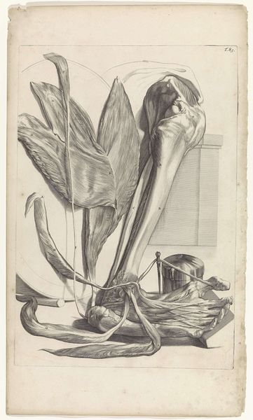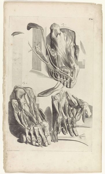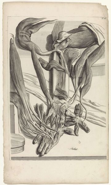Editor: Here we have "Anatomische studie van de pezen en de beenderen van de rechtervoet," or "Anatomical study of the tendons and bones of the right foot," a 1685 etching and print by Pieter van Gunst. The exposed muscles and tendons are a bit unnerving. What do you see in this piece? Curator: It's fascinating, isn't it? Beyond the anatomical precision, which was a major focus during the Baroque era, I see this as a potent reflection on the body as a site of both vulnerability and resilience. In the 17th century, anatomical studies weren't purely scientific; they touched on philosophical and even spiritual questions about human existence, prompting conversations around identity, societal roles, and even mortality. How does its realism speak to our contemporary understanding of the body? Editor: It makes me think about medical ethics. Today, consent is paramount. Was there an awareness of that back then, or was the focus purely on expanding scientific knowledge regardless of the cost? Curator: Precisely. Thinking about the historical context, whose bodies were being dissected? How did social hierarchies, like gender and race, play a role in whose bodies were accessible for study and what assumptions were then made? It forces us to confront how power operates in the pursuit of knowledge and to consider whose perspectives are centered and whose are marginalized. Does that context influence how we view the image? Editor: Definitely. Seeing it now, I’m struck by the ethics of representation and the complex power dynamics at play, especially considering whose bodies are historically made visible and vulnerable. Curator: Exactly. It pushes us to confront difficult questions and see beyond the surface.