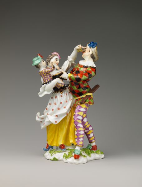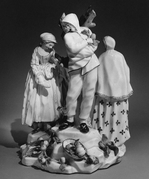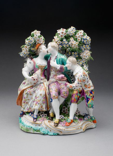 Curator: Well, isn’t that darling? The name of this piece is “Lovers and Clown,” made sometime between 1750 and 1760 by the Derby Porcelain Manufactory. Editor: Darling, indeed. I get an almost…saccharine feeling from it. All that frilly detail, those blushing faces... it's intensely Rococo. The almost too-perfect scene, crafted so meticulously in miniature... Curator: Miniature! Yes! I find myself wanting to just, cradle it, and wonder about all the hands it must have passed through in its lifetime. Its permanence versus our fleetingness…it's all very humbling. Editor: The composition strikes me as cleverly structured. Notice how the figures form a triangular arrangement, stabilized by the tree trunk. The lines are elegant but confined. It speaks to a world obsessed with order, yet hinting at underlying passions—that almost grotesque little clown seems out of place in this “ideal scene," adding tension to an otherwise predictable harmony. Curator: But isn't it like life itself, though? The comedy lurking beneath the beauty? I feel that the artist might've wanted to say love comes with its own brand of theater, complete with its observers. And even in something so "posed", there are the undeniable yearnings and hopes that bind us. It reminds me of… being young, wanting to have grand romances as an adolescent… Editor: That reminds me of Barthes, with his breakdown of images, identifying how objects can represent bourgeois sentimentalism! Each tiny blossom, each delicately rendered expression speaks of very specific cultural codes— the porcelain seems deliberately chosen, because it represents wealth, taste, but it also breaks easy... Curator: Breaks so easy... I suppose it's a good mirror to the human heart then, no? Well, I'm truly happy that the work inspires conversations across time and the spectrum of thoughts! Editor: Agreed, it proves that formalism is never against enjoyment. This piece can teach you both ways, not one!