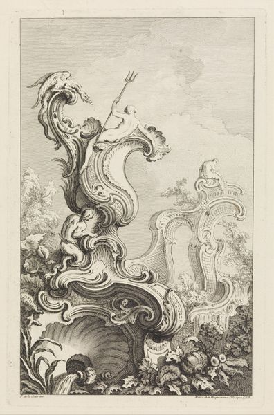 Curator: This intricate pen and ink drawing is titled “Cartouche met engel,” created in 1738 by Franz Xaver Jungwirth. It exemplifies the Baroque style. Editor: Wow, the energy practically jumps off the page! I'm immediately struck by how dynamic it is, with that angel blowing a horn and the putto with the flag – the artist uses the ornate frame so inventively, it's bursting with vitality. Curator: Precisely. The piece reflects the Baroque fascination with elaborate ornamentation. Consider how Jungwirth utilizes allegory; the angel symbolizes, perhaps, divine inspiration or a heavenly messenger, elements prevalent in that era’s art, religion, and social function. Editor: And notice how these cherubic figures inhabit a space filled with symbols of earthly power. We've got suggestions of war, nobility – that implies so much about the power dynamics and hierarchies present then. Was Jungwirth commenting on them or simply illustrating them? Curator: As an artwork approved and operating under royal privilege, as indicated in the lettering on the print, Jungwirth’s aim was less critique, more glorification of the patron. Images like these visually reinforced the authority and grandeur of ruling houses. This wasn't meant for a revolutionary pamphlet. Editor: That's a critical point. It reminds us that access to resources, including artistic talent, was concentrated among the powerful. The very creation and dissemination of an image like this served a specific political function. Looking closely, even the landscape elements in the foreground reinforce a hierarchical perspective, no? Curator: Undoubtedly. The use of engraving suggests reproduction and widespread dissemination. The intent here was to circulate and broadcast a particular worldview and set of values. The frame itself acts almost as a proscenium. Editor: It really makes you consider what kind of impact artworks like this had on viewers back then – shaping perceptions, reinforcing societal norms, all wrapped up in seemingly decorative images. Curator: Indeed. It’s an important reminder that art always exists within a context – social, political, and historical. Considering that lens is critical to understanding its meaning and purpose. Editor: Absolutely, and looking closely, even at something so seemingly decorative and of its time, reveals underlying currents about power, representation, and social order. Curator: The richness of context that reveals much about that world and reminds us to consider it within our own.