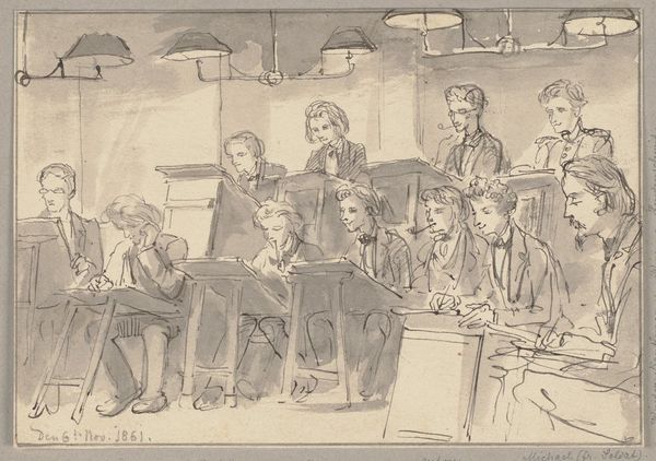 Editor: Here we have "Dirigent met orkest," or "Conductor with Orchestra," a pen and ink drawing by Theodorus Henricus Kerstel, created sometime between 1869 and 1936. The image has a kind of bustling energy despite its stillness. All those lines seem to vibrate. What do you see in this piece? Curator: Oh, I adore the *sketchiness* of it, don't you? It’s like catching a fleeting moment – the prelude to a grand performance, perhaps. Kerstel isn't trying to give us photographic realism. He is instead capturing the feeling of anticipation. You can almost hear the tuning of instruments, that chaotic yet harmonic pre-concert buzz, can't you? Notice the conductor. Editor: Yes, he seems to command attention, despite being… well, a sketch. Curator: Exactly! His raised baton, his somewhat… theatrical expression – it speaks of leadership and passion. Think of the era! Late 19th, early 20th century. A time when the conductor was practically a rock star! And consider Kerstel's choice of medium – simple pen and ink. No fuss, just pure expression. It feels so raw and intimate, as if you stumbled upon his private sketchbook. Almost like a secret glimpse. Editor: That's a really great point. It does feel very immediate and personal. So less of a formal portrait, and more of a captured moment of inspiration? Curator: Precisely. Maybe Kerstel heard a concert and rushed home to capture the essence. It sparks a lot of 'what if' questions in my mind, doesn’t it yours? The beauty lies in its suggestive quality, in leaving room for our imaginations to fill in the blanks. Who were these musicians? What symphony were they about to play? We can almost compose the scene ourselves. Editor: I love that! Thinking about it that way has completely changed how I see the piece. Curator: Wonderful! Art is at its best when it engages in the conversation with us, when we each find our meanings, isn't it?