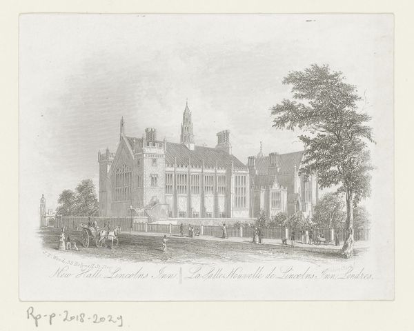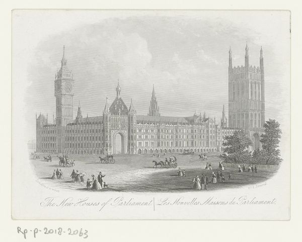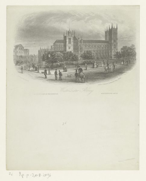Editor: Here we have a print entitled "Gezicht op Westminster Abbey, te Londen," dating from 1841 to 1885. It's an engraving and strikes me as quite serene, almost otherworldly, because of its pale color scheme and strong verticality. What do you notice first when you look at this work? Curator: Initially, the artist's rigorous use of line to articulate form arrests my attention. Observe how line dictates architectural structure, creating intricate patterns across the Abbey’s façade, balanced with gradations of light achieved through subtle variations in linear density. This interplay reveals a calculated investigation of pictorial space. Does the precision with which the architecture is rendered suggest anything about the engraver’s intent, in your view? Editor: Perhaps a reverence for the subject or a desire for accuracy? I'm curious about the choice of viewpoint – slightly off-center. Curator: Precisely. It's a compositional choice worth exploring. This vantage point emphasizes depth and allows for the articulation of varying textures between the foreground elements - the carriage and figures - and the more distant, monumental edifice of the Abbey. We see a deliberate juxtaposition between the ephemeral and the enduring. Are we meant to contrast the static nature of architecture against human activity, or are both merely artistic opportunities in tone and line? Editor: That's fascinating. I hadn't considered that. The artist seems preoccupied with perspective, but less so with the human elements. Curator: Yes, it is a landscape concerned with balance above all, line for the depiction of surface and volume, light achieved through hatching and, perhaps most revealingly, shadow for counterpoint. Editor: Thank you! This has helped me appreciate how much information can be conveyed through careful observation of formal elements. Curator: Indeed. By engaging with these compositional aspects, we deepen our aesthetic experience.