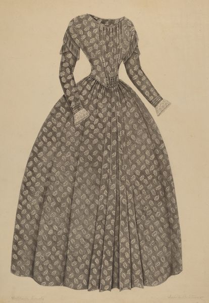 Curator: So, here we have a drawing titled "Dress" by Melita Hofmann, likely created around 1937. What’s your first impression? Editor: It’s… ghosts of fashion past! Seriously, I’m getting spectral vibes, like this dress just floated in from another century. I love the lightness, even in the draftsmanship; the puffed sleeves give it such a romantic silhouette. Curator: The date is significant, situating the work in a pre-war era where fashion often emphasized a return to traditional femininity, a stark contrast to the more androgynous styles of the 1920s. We see that high neckline, the cinched waist. How do you feel it relates to conceptions of identity or perhaps gendered expectation? Editor: Expectations, for sure. Those sleeves are amazing but not exactly practical. It whispers 'leisure' and a very specific presentation of womanhood – one focused on display, on grace, more than getting stuff done. What did she *do* in this dress? Curator: Exactly. Though only a design, the drawing represents those expectations materialized as garments and their societal impacts and influences on wearers, while speaking also to aspirations for beauty during times of global insecurity. And how are we to read it, then? As subversive, or submissive? Editor: Maybe a bit of both? I picture the person who wore it finding a certain freedom within those constraints, a personal expression bubbling up from within the expected forms. Those gathered fabrics hint at volume, secrets... or just maybe it tickles. Either way, for me, it embodies something deeper than simple aesthetics. Curator: Thank you. I appreciate that reading, especially in its willingness to understand the past not as a static entity, but as a mutable collection of both oppressions and unrecognized or unrealized agency. Editor: You're welcome. After all, every outfit is a story.