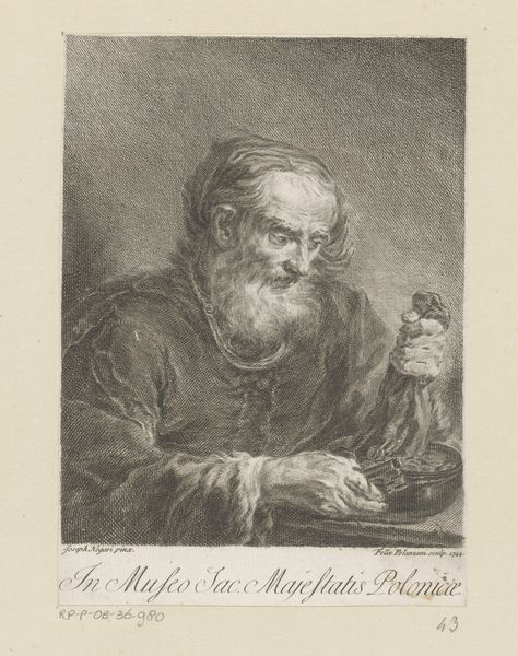 Curator: Here we have Rembrandt van Rijn's etching and drypoint print, "Jan Lutma," created in 1656. There's a somber air about it, wouldn't you say? Editor: Absolutely. The deep shadows and the weight of the figure create a very palpable sense of gravitas. It's a character study, etched into copper, that explores aging and intellect. The composition leads the eye to Lutma's hands and then back up to his knowing face. Curator: The light, almost exclusively illuminating his face and hands, draws immediate attention to his intellect and craftsmanship. Observe the chair, adorned with grotesque masks—these classical motifs were sometimes linked with artistic inspiration and protection from malevolence. Editor: And those masks…grimacing and gazing forward, guarding his genius perhaps. This is baroque portraiture imbued with symbolic depth. Lutma seems the embodiment of the successful craftsman, tools present, mind clearly active, settled comfortably into a wealthy existence. Curator: Notice also the layering of textures. From the smooth paper to the varied etched lines—it really enhances the illusion of depth, especially in rendering Lutma's luxurious fur-trimmed robes. He truly masters the tonal scale within such a small print. Editor: The subject seems weighed down by a heavy history of creation; look how those etched lines furrow his brow. There's a deep-seated narrative here, a lived life expressed through his very posture and the meticulous textures of his garments. Rembrandt lets us perceive the artist's mind, at ease. Curator: It shows that through skilled composition, balanced tonality and carefully placed lines, a work's emotional narrative emerges almost purely through form. Editor: Precisely, and by concentrating on the relationship between symbol and subject we get more depth on the significance of craft. I keep seeing this print as a testament to human creative endeavor, of wisdom gained through long artistic engagement with craft. Curator: An interesting, quite persuasive interpretation! I focused so intensely on how these formal components convey and elevate a realistic subject in this etching. Editor: Perhaps that contrast itself encapsulates art and craftsmanship and its intrinsic power.