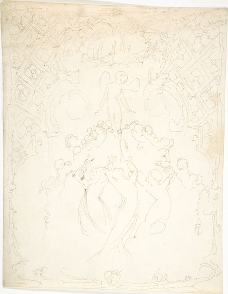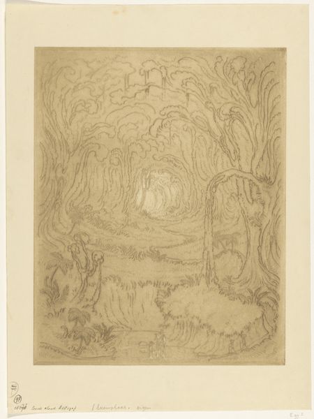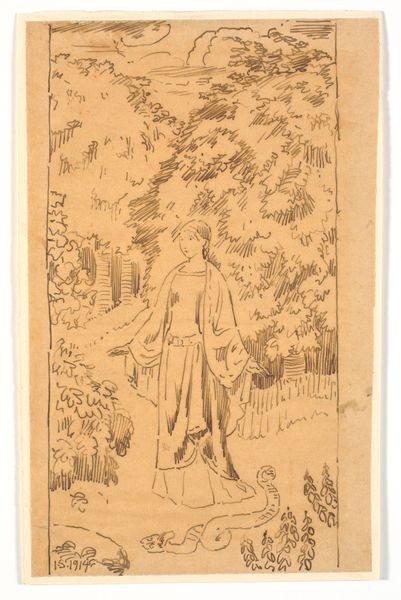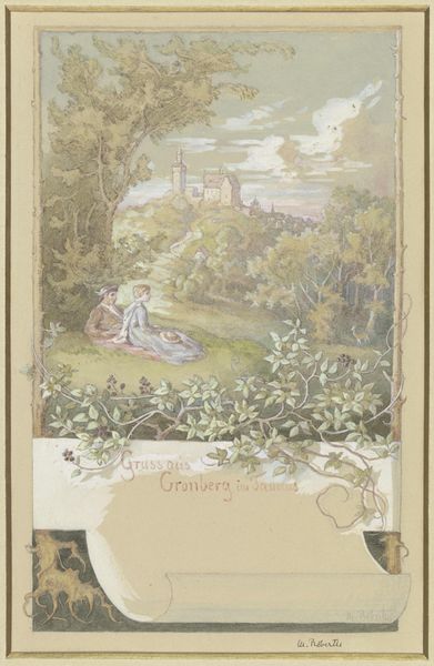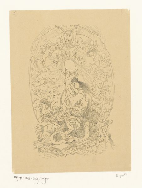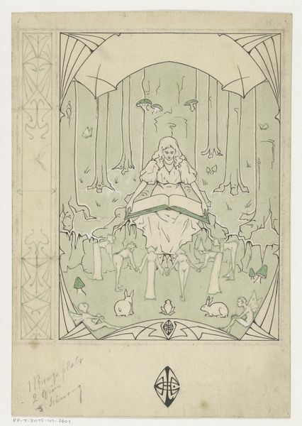 Curator: Welcome. Before us hangs "Transvaalse prent," an etching created in 1902 by Antoon Derkinderen. The composition is predominantly a soft monochrome. Editor: It's striking how this print seems to exist in a space between dream and reality. The color palette, so muted and nearly tonal, creates a haunting sense of nostalgia. What draws your attention in terms of form? Curator: I'm intrigued by the spatial arrangement. There are layered planes from foreground to the distant ships, unified by a conceptual symbolism. Consider how Derkinderen orchestrates these spaces within the defined boundary, the edge creating formal containment and thematic intensity. Editor: Yes, but how was this achieved through his method? Understanding the labour of creating an etching gives such insight into the visual affect of this print. Note how the fine, precise lines of the etching serve to create these subtle gradations in tone. What stories of production can we uncover? The paper itself – its sourcing and quality – speaks to a wider context of the print's materiality, right? Curator: Indeed. His employment of symbolic imagery like the woman reading, the landscape, and the flag offer layers of meaning; the symbolic language operates within a formal structure. Observe how these motifs harmonize formally. It's more than just their immediate context but how these various forms correspond and respond. Editor: Yet, thinking about production deepens the impact. This piece was created in 1902. Can we assume its quick creation, serving as instant media, to communicate particular messages about a war? Here is the material process placed firmly within a political landscape, literally pressing ideological messaging onto the paper. Curator: A convincing reading. I admit the material and process here does amplify the symbolic message. Understanding the interaction enriches my appreciation for this piece and the social conditions to which Derkinderen responded. Editor: Likewise, reflecting on production helps understand the emotional weight this object might have carried, and its power as a means of circulating ideas and opinions during that period.