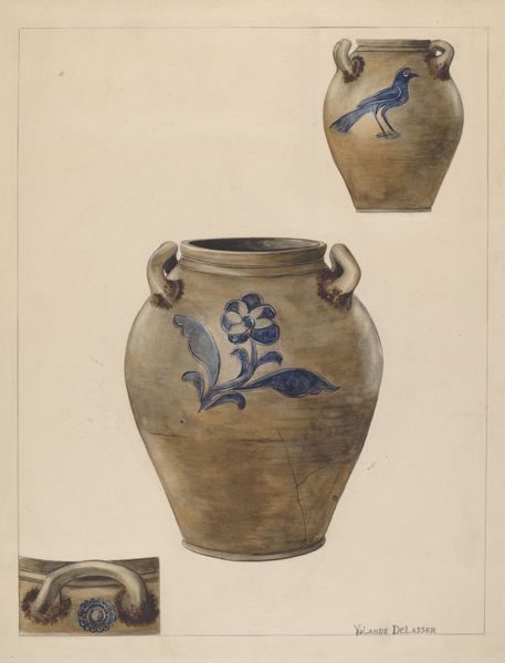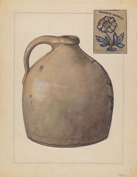 Curator: This is "Jug," a watercolor from around 1936 by Samuel Sulkowitz. Editor: It's surprisingly calming. There’s something very grounding about the object rendered in such soft, earthy tones. And there are folk art details, like that painted bird, which is delightful. Curator: Yes, that small decorative rectangle adds a touch of charm. I wonder, what kind of commentary might Sulkowitz be making with this depiction of an everyday object? There's something inherently populist in focusing on a simple jug. Editor: Absolutely, you can view it as an affirmation of the value and beauty inherent in the mundane, the domestic sphere. We see an elevation of the overlooked object—a subversive act in its own way. Consider how gender is at play too; the domestic sphere has been traditionally feminized and subsequently, devalued. Highlighting this jug becomes an act of resistance against such conventions. Curator: I see that. And how might that interplay of tradition and value speak to the social context of its creation? The mid-1930s were hardly stable. Consider the rise of totalitarian regimes abroad; a piece like this quietly celebrates American material culture. Editor: Or maybe it speaks to the cultural importance of preservation and heritage. There is a strong focus on a specific cultural history in seemingly innocuous works like this, perhaps a reclaiming of cultural identity when certain narratives risk erasure. Curator: Interesting. I also notice the muted palette; it's so evocative. Were these materials easily accessible at the time? The constraints on artists, especially during periods of social unrest, have such a powerful impact on style and subject matter. Editor: True. Looking at the brushstrokes and the shadowing around the jug's body, I am particularly drawn to its depth, and volume. There’s something both solid and yielding about it. Curator: That's the wonderful tension in Sulkowitz’s style. The precision combined with a touch of whimsy is lovely, isn't it? It gives us pause, makes us reflect. Editor: It does. This simple image reminds us of the narratives embedded in objects we often take for granted, prompting reflection on everyday heritage.