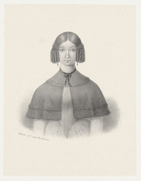 Editor: Here we have "Portret van Antoinette Marie Henriette Jeanne Reigersman, echtgenote van Jonkheer Mr Pieter van den Brandeler," a pencil drawing crafted around 1840 by Alexander Cesar August Valois. The soft greys lend a certain ethereal quality to the portrait. What's your take on it? Curator: It whispers of Romanticism, doesn’t it? A quiet intensity. Notice the soft, almost blurry edges; it's like she's emerging from a dream. This was a time when artists weren’t just documenting, but idealizing. Editor: Yes! The subtle details really stand out given the medium. Her gaze feels both direct and a little sad. Curator: Indeed. There's a certain formality expected of portraits, especially of that era. This, however, possesses an underlying psychological complexity. Valois, you imagine, saw beyond the surface, perhaps even hinted at the woman’s inner world through the way the light catches her eye, and those shadows! Does the artist want us to focus solely on the aesthetic, or to perhaps consider this woman's station in life at this time? Editor: Interesting! I hadn’t thought of that. I suppose that looking closer the ruffled dress indicates status, too. Curator: The ruffles certainly catch your eye. But let’s be honest: it's that gaze that really pulls you in, isn’t it? Editor: Absolutely! I now understand more clearly the contrast between technical mastery, Romantic idealisation, and social position at that time. Curator: Exactly! Art acts like a magic portal to understanding different perspectives on both its subject and the wider society.