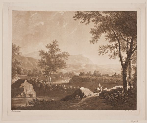 Jacobus Theodorus Abels created this drawing titled 'Landschap met boerderijen tussen bomen' using pen in gray ink and brush in gray and brown. Abels lived during a time of significant social upheaval across Europe, including here in the Netherlands. In this period, there was a shift in how the landscape was represented. It was no longer just a backdrop but a central theme, reflecting ideas about national identity and the common person’s connection to the land. Notice the details of the figures, perhaps a mother and child, walking along the path. Their inclusion brings a sense of everyday life to the landscape, which was important to artists who wanted to show the reality of rural life. While the drawing is quiet, it speaks to broader themes of belonging and the relationship between people and their environment. It subtly challenges more idealized versions of rural life by focusing on the simplicity and naturalness of the scene. It invites us to reflect on our own connections to the places we inhabit.