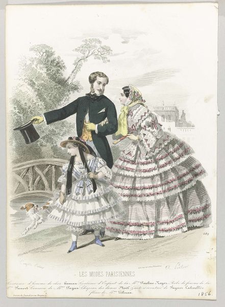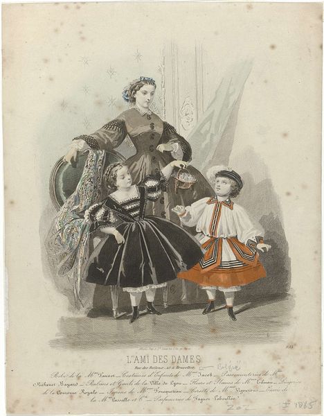 Curator: Let's examine "Cendrillon, ca. 1871, No. 34: Journal des petites Demoiselles..." by P. Deferneville, which appears to be a coloured-pencil print. My first impression is that the artist skillfully captured the texture of the textiles, giving the garments a tangible presence. What strikes you initially? Editor: Immediately, the pronounced tiers of the dress on the right grab my attention. It reminds me of cake frosting, layer upon layer. It definitely speaks to the luxurious materiality and construction involved in creating such elaborate fashions. Curator: Absolutely, and we must consider that these images were printed in journals geared towards young women, instructing them on the virtues and importance of refined, bourgeois fashion during that time. What statement do you think those constructed identities made? Editor: These materials and their making certainly embody the labor and consumption of the upper class, particularly in Paris, then a hub of industry. Notice how each ruffle, each seam would have required specialized labor. The print serves almost as a catalogue of skills and social class, made attainable to consumers. Curator: Precisely. Fashion became a way to express cultural values. How did class affect someone's personal value in this particular context? Editor: Mass production and consumption during this era created aspirations, and also anxieties, to keep up with the trends. The print itself would have circulated widely, shaping desires, demanding production of cheaper imitations, but also accentuating that sense of unattainability for those outside the petite demoiselle circle. Curator: Exactly! This also emphasizes how the intersection of class and gender profoundly shaped women's roles and identities in the 19th century. Now, turning back to Deferneville’s methodology, what elements of this work speak of materiality? Editor: Look at the specific rendering of fabric in light and shadow. Deferneville painstakingly details lace trims, the heavy folds of fabric and also conveys texture, whether in smooth satin or fringed wool. And consider the labour that goes into each illustration replicated to a large scale... Curator: Agreed, this era allowed women the opportunities for growth, expression and entrepreneurship within limits. It is all encapsulated right here. Thanks, this was illuminating. Editor: Indeed. Exploring the creation and consumption through a tangible perspective definitely helped unlock greater understanding of that era’s complex and nuanced production.