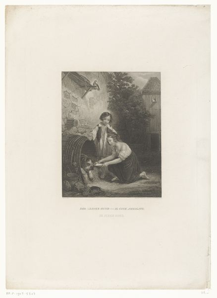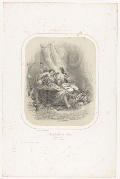 Curator: This engraving, titled "Jong koppel in een gevangenis," which translates to "Young Couple in a Prison," dates from 1817 to 1866 and is the work of Charles Cousin. The print is made from ink on paper using the engraving technique. Editor: It strikes me as surprisingly tender. Even in monochrome, the way the artist plays with light and shadow conveys a certain intimacy within the stark confines of what I presume to be a prison setting. Curator: Precisely. Cousin uses the stark contrasts afforded by the engraving to direct our focus. Notice the placement of the couple in the composition—centrally located and bathed in light—against the rougher texture of the prison wall and other elements pushed into the shadows. This formal decision isolates them in their embrace, making their connection the focal point. Editor: The title places the characters within a history or period narrative of knights and chivalry, inviting discourse regarding power, social constraints, and the individual within larger societal frameworks. Are they imprisoned by circumstance, love, or a societal decree? Curator: Interesting question! The medium of print and the period, somewhere within Romanticism, suggest it likely circulated fairly widely and would have triggered multiple, sometimes contradictory readings about freedom and constraint among viewers. The diagonal lines created by their forms provide tension, contrasting to the heavy verticals and horizontals representing the imprisonment space, thus evoking imprisonment and the romantic moment simultaneously. Editor: Exactly. There is something about their closed eye embrace that shuts out a reality perhaps too awful to consciously accept. It prompts the questions of what constitutes freedom. What do love and resistance look like within institutional boundaries? It also prompts a gender analysis in a time period where patriarchal structures confined women, how might their status contribute or complicate our understanding of freedom? Curator: I concede to your viewpoint, since the artwork doesn’t dictate a unique viewpoint; rather, its enduring quality relies on an interpretation. Cousin masterfully juxtaposes shadow and light, but also societal expectations and private emotions— Editor: —revealing a deeply nuanced tension in which both formal qualities and our historical contextualization produce new layers of understanding. Thank you! Curator: Thank you.
