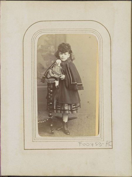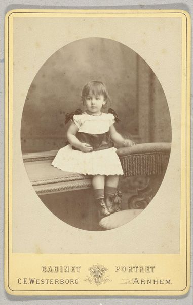 Curator: Before us, we see a mounted albumen print entitled "Portret van een meisje bij een tafel," dating from somewhere between 1855 and 1885. The artist is identified as Kasparus Karsen, and the piece resides here at the Rijksmuseum. Editor: My immediate impression is one of contained fragility. The sepia tones mute any vibrant life, focusing the attention on the subject's delicate features. She seems poised, almost uncomfortably so. Curator: Indeed, that stillness is essential. Observe the precise triangular composition formed by her dress and the support she uses; how her dark shoes anchor her weight, while her gaze softens the visual impression of the photo's texture overall. There's a strong reliance on geometric form here. Editor: I read the formality differently. The patterned dress and table seem to hint at prosperity, an aspiration of middle-class values, perhaps. Her small bouquet mirrors those cultural sentiments toward the symbolism of new wealth, innocence, and the transient nature of beauty. It’s very coded, don't you think? Curator: The image surface supports this; the soft blurring technique adds to the sense of the unattainable, as if smoothing out all imperfection to present a constructed image. Yet, at the same time, we see the scratches and faded areas: evidence of reality interfering with the image maker's design. Editor: And her stance—balanced precariously on what looks like a stool or footrest!—contributes further. A child presented with dignity and seriousness to conform, which creates emotional dissonance with what the symbolism tries to represent. A symbol for both loss and preservation. Curator: It's tempting to draw conclusions based on these contrasts. But ultimately, what remains is a formal rendering which, in its tonal gradations and compositional stability, achieves a sense of lasting permanence beyond fleeting trends in taste. Editor: Perhaps that is exactly what is compelling: to preserve, in the symbolic gestures and rigid composure, a fleeting, emotional truth about a specific time in history. To freeze both individual personality and social pressures. Curator: Thank you for sharing your perspectives; it offers quite a contrasting viewpoint on photographic portraiture within its historical period. Editor: My pleasure, your insight into the composition makes it far more complete.