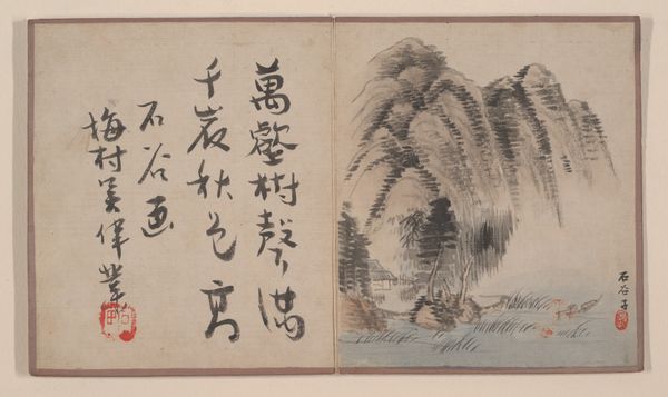 Editor: Here we have Hokusai’s “Picture Book on the Communication of Home Precepts part III,” a woodblock print from between 1838 and 1858. It's quite striking to see these two contrasting scenes juxtaposed on facing pages. The image on the right evokes a sense of journey, maybe even escape, whereas the image on the left is tranquil and domestic. How do you interpret this work in relation to the title and Hokusai’s social context? Curator: That contrast is key, and the title gives us a starting point. "Home Precepts" suggests moral and social guidance. Looking at the book as a whole, considering its function within 19th-century Japanese society, we can see it operating on multiple levels. For whom were these precepts intended? And how might illustrations of travel and idealized landscapes shape their understanding of social roles and expectations? Editor: So, you're suggesting that the imagery might reinforce societal norms rather than just passively reflecting them? Curator: Exactly. Hokusai wasn't merely depicting life; he was participating in a discourse about how life *should* be lived. Consider the prevalence of landscape prints during this era. Who had access to these images? Were they a form of escapism, or did they serve to remind viewers of their place within the social hierarchy and prescribed gender roles? Editor: It’s almost like the image on the left—the domestic scene—becomes a kind of visual instruction, while the ship signifies an unattainable freedom for some. Curator: Precisely. And remember, Hokusai himself navigated a shifting social landscape. Reflecting on that context gives new meaning to this piece. What do you take away from that consideration? Editor: I had been thinking of it purely in aesthetic terms but recognizing the social and gendered dimension provides a new way of thinking about it. Curator: Exactly. These images aren't neutral; they're active participants in the construction of culture.