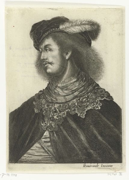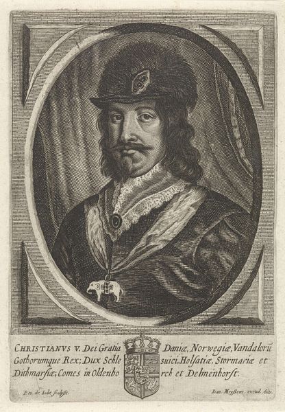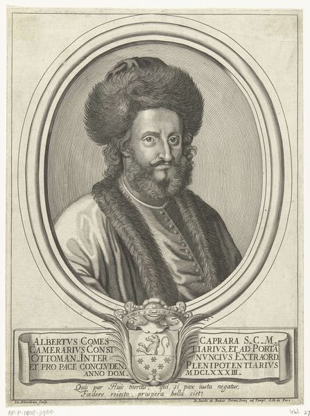 Jacobus Harrewijn created this portrait of Charles III, Duke of Bourbon, using engraving, a printmaking process reliant on sharp tools and skilled hands. The artist incised lines into a metal plate, likely copper, to hold ink and transfer the image onto paper. Consider the labor involved: each line meticulously carved, building up tone and texture to depict the Duke's likeness, his fur-trimmed robes, and elaborate helmet. The cross-hatching, especially in the background, demonstrates the engraver's dexterity and control. This technique allows for subtle gradations of light and shadow, adding depth to the image. Engraving was a meticulous craft, demanding precision and artistry. The resulting prints, like this one, could be reproduced and disseminated widely. In that sense, it’s connected to burgeoning capitalism, allowing images and information to circulate more freely than ever before, and creating a market for the printed image. It’s no longer just about unique artworks, but the multiplication of images. The relatively small scale of the work also suggests its potential for private use. Appreciate not only the artistry but also the intricate process that brought this portrait into being.