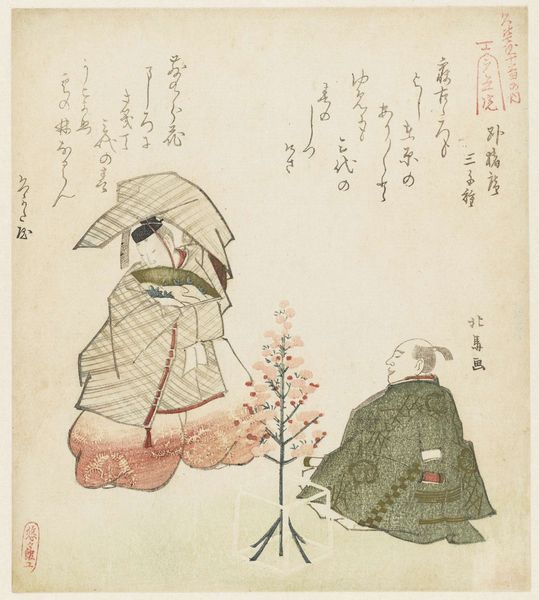 Uematsu Tôshû created this woodblock print titled "A Courtier Standing by a Man in a Boat," and it offers us a glimpse into the stylized world of Japanese Ukiyo-e art. During this period, artists like Tôshû navigated the complex currents of Japanese society, which was rigidly stratified by social class. The figures depicted, likely members of the court, reflect the aesthetic values of the elite, embodying ideals of beauty, status, and cultural refinement. The print also shows an interesting interweaving of text and image. Calligraphy was a highly respected art form, often linked to social standing and education. The script accompanying the figures may offer insight into the narratives or social commentaries that Tôshû was subtly embedding in his work. Consider the emotional atmosphere of the artwork: do you feel a sense of reverence, detachment, or perhaps an ironic commentary on the social hierarchy of the time? This piece not only captures a moment in time but also invites us to reflect on how social roles and artistic expression intertwine.