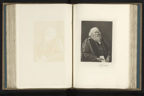 Curator: What strikes me most viewing this albumen print from before 1891, "Portret van William Thomson," is the profound sense of a life dedicated to contemplation. Editor: It has such an intense and almost contradictory feeling of importance, of monumentality, even, set against the fragility of the material and the very soft focus. This dichotomy is interesting. Curator: The choice of the albumen print intensifies the intimate moment. You get such rich tonality compared to a modern digital photograph, the subject and image merge, and in effect William Thomson's essence seems burned onto the photographic page as a modern icon. Editor: I'm fascinated by this book format; by placing what appears to be two distinct portraits side by side, separated only by their tonality. Are they meant to show before and after, or is this a class commentary on visibility and access? What is the function of portraiture and its purpose in society at this time? Curator: Perhaps one serves as the plate for the actual, finished portrait, a method by which many iconographic portraits were first conceived and later brought to final realization. It serves to show a hidden stage of making, of revelation. It’s beautiful. Editor: It definitely speaks to portraiture's role in constructing identities within scientific discourse and perhaps even as an explicit nod to documentation of this scientist’s presence. There is, nonetheless, an exclusion enacted when his presence seems less “complete,” by a portrait being rendered faint. Curator: Perhaps also a meditation on memory itself—how clear and vivid some aspects remain while others fade with the passage of time, that his essence continues, recorded through the work of his hands. Editor: Yes. Considering portraiture as an engagement of subject, memory, and document really helps bring to light issues concerning value and continued visibility through history. What has he written, who will see this portrait? Curator: What do you make of it now? Editor: Seeing the relationship between these historical narratives of the book format and portraiture certainly creates space for contemporary reflection.