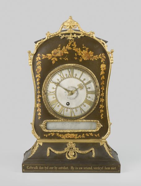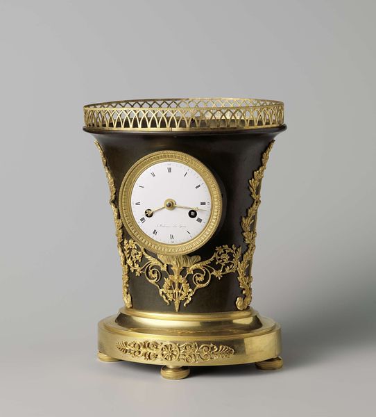 Curator: Before us is a remarkable object, a planetarium clock created around 1820 by F. Ducommun. It takes the form of a tower and features beautiful enamelwork. Editor: It’s quite stunning. My immediate impression is that this is a visual declaration of control over time and the cosmos. The glint of the gold-toned metal enhances the feeling of prestige. Curator: Absolutely. Let's consider the vertical structure: The base supports a fluted column, itself adorned with garlands, with a clock face and enamel detailing up top—creating distinct compositional zones. The circular form creates a harmonious flow from base to top, where the planetarium rests. Editor: Those enamel details seem to depict the signs of the Zodiac. That celestial theme is further reinforced by the globe at the very apex. The object’s purpose isn’t purely functional. This would serve as a symbol of worldly and intellectual power for its owner, placing them at the center of the universe, metaphorically speaking. Curator: Yes, the symbolism is crucial. Time, progress, knowledge, and prestige were deeply intertwined with these early scientific instruments. Note how the golden sheen of the clock and decorations enhance these readings. Editor: It really merges aesthetics with cosmological significance. This wasn’t just about telling time, but about aligning oneself with the great movements of the cosmos. In fact, you can still observe a societal need for people to feel this control or connectedness; horoscopes for instance, while seen as pseudoscience now, share that deeply rooted purpose. Curator: Exactly. A remarkable fusion of craftsmanship and concept. The planetarium clock is more than the sum of its parts. It’s a tiny material philosophy. Editor: Yes, a powerful emblem of aspiration, reaching from the terrestrial to the celestial, encapsulated in one small object.