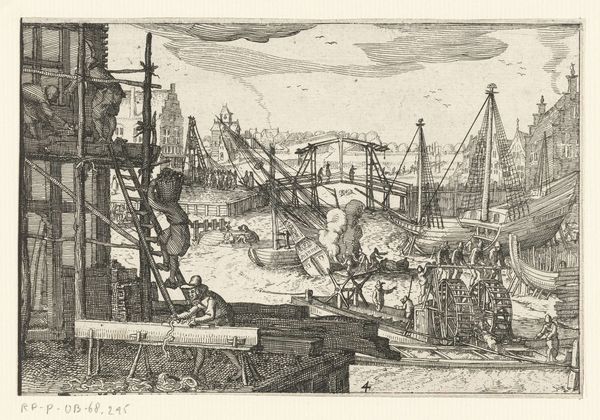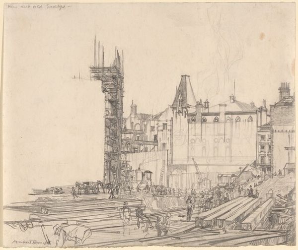Curator: "Coal at Cardiff" is an etching crafted by Joseph Pennell in 1910. It now resides here at the Minneapolis Institute of Art. My immediate sense is one of oppressive industry. What's your initial take? Editor: Well, it's a surprisingly delicate image, considering its subject. The skeletal cranes, repeated like motifs across the scene, remind me of towering, watchful figures in a desolate industrial landscape. There is something elegiac about the scene as a whole, maybe suggesting decay, not at all dynamic and energetic. Curator: Right, and consider the process of etching, layering the marks onto the metal plate; there's a laboriousness echoed in the manual effort depicted on the docks themselves, wouldn't you agree? The sheer physical toil inherent in loading coal would have been quite intense for the workers. Editor: I'm struck by how those skeletal crane figures visually dominate. Their forms repeat, establishing a network. Are these icons of progress or warning signals for future decline? The recurring motifs—these gaunt metal structures—lend a narrative weight, maybe speaking of broader forces shaping our human endeavors. Curator: Good point. The print's existence itself, as a multiple, hints at how these images become part of broader visual culture shaping our consumption habits and acceptance of industrial landscapes as they developed throughout the 20th century. We could think of it as an example of proto-industrial sublime... the human compulsion for control of landscape and materials. Editor: But are these structures simply steel? Think beyond the tangible. They embody striving. They speak of mankind’s reach, touching skies. The image has cultural memory embedded within it—echoes of ambition, labor's symbolism, dreams materialized through construction and industrial energy. What meaning did such industrial monuments hold for that society at that moment in its own history? Curator: A useful reflection that is so visible within these images of what at that point may have seemed like endless resources, exploited for an unending growth. Considering today’s climate concerns, it allows one to reflect on the processes that started more than 100 years ago. Editor: The emotional residue of this etching resonates profoundly—an intriguing encounter that made me consider meanings encoded across time through our symbols, their persistence inside human imagination. Curator: Indeed. An opportunity to recognize this convergence of production, social implications and personal symbolic understanding... thanks for sharing this view!
