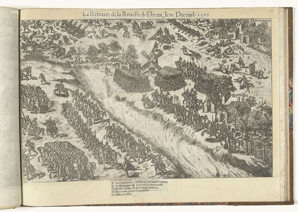 Curator: This engraving, dating back to 1570, illustrates "Slagorde van de legers in de slag bij Dreux, 1562," or, "Order of the Armies in the Battle of Dreux" by Jean Perrissin. Editor: My first impression is one of immense detail, and perhaps, detachment. The composition is so comprehensive, depicting the entire field, that the individual human element seems lost. Curator: It's an exercise in power, isn't it? You see how Perrissin maps the organization of forces, and note the legend carefully identifying key leaders and units, almost like a symbolic order affirming hierarchical authority. Consider how such images reinforce social roles. Editor: I can see that, absolutely. There's almost a flattening effect – everything becomes data. And yet, look how Mannerism manifests; notice the subtle elongation of figures and almost decorative arrangement of the troops, it lends a strange artificiality to a real historical moment. Curator: Indeed. This isn't just reportage, but rather a curated view shaped by specific aesthetic and ideological currents. Consider how the 'bird's-eye' perspective and detail amplify the perception of strategic control. I think that contributes directly to the painting's effect and intent. It speaks to how history becomes narrative. Editor: It raises interesting questions about the role of art and images as tools of power. The formal style, I believe, serves to distance us emotionally, while simultaneously impressing upon us the sheer scale and meticulous organization. Curator: It reminds me how historical prints like this circulated widely, not only informing but also shaping public understanding and often, supporting established powers through carefully constructed visual narratives. It becomes more than documentation; it solidifies perception. Editor: Thinking about how people viewed it in the 16th century versus today. I suppose its political impact, if that was a major goal, may be more or less lost to our eye, but what remains, thankfully, is the record of visual thinking and social hierarchy. Curator: Indeed. I think it offers us an opportunity to ponder visual records as potent communicators of social memory and cultural value.