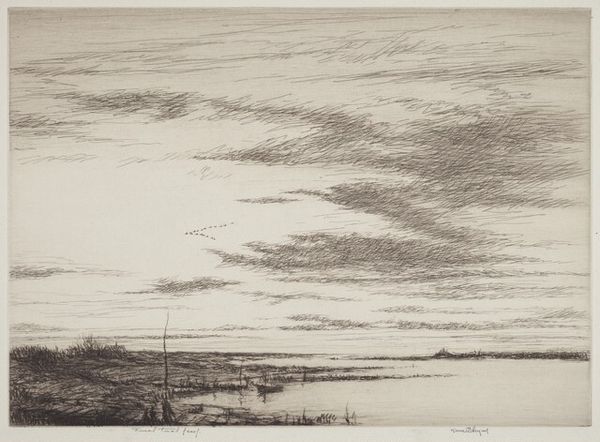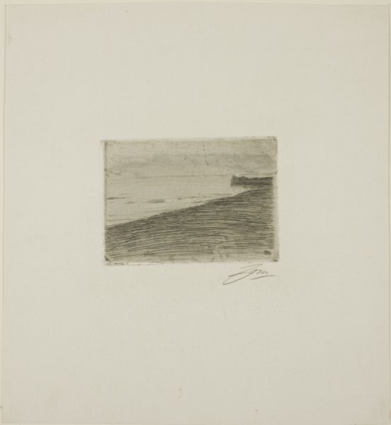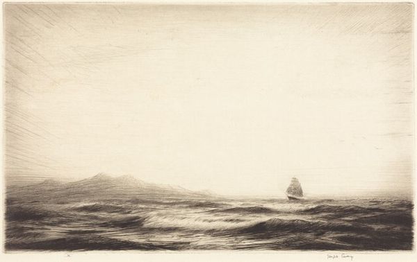 Curator: I find "Sundown, Appledore," etched by Childe Hassam, incredibly calming. The silvery tones evoke such stillness. Editor: Yes, there's a quiet drama to the sky. Appledore was part of the Isles of Shoals, a late 19th-century artist colony, and this print captures its isolated mood. Curator: It feels like a memory, almost dreamlike. The scratchy lines are so suggestive. Do you think Hassam was trying to recreate a feeling more than a scene? Editor: Absolutely. Prints were becoming increasingly accessible, so they offered a way to democratize art, bringing atmospheric landscapes into people's homes. Curator: It's captivating how he manages to evoke the vastness of the sea with such delicate lines. Editor: Indeed. The tonal range achieved through etching gives it a photographic quality too. Hassam's print creates a sense of place while also hinting at something universally felt.