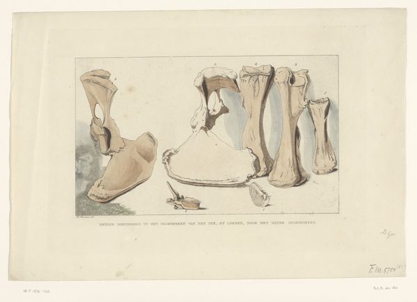 Curator: Right, let’s have a look. Willem Hendrik Hoogkamer made this pencil and graphite drawing in 1820. It’s titled "Bones found in Heukelum, 1820." It’s part of the Rijksmuseum collection. Editor: Huh. So, bones... Found. It’s stark, almost clinical. What strikes me is the kind of quiet emptiness these shapes evoke. The stark pencil lines capture something unsettlingly fragile about what remains. It is almost ghostly! Curator: Precisely. And while appearing simply as a still life, this image serves as a record of a specific discovery, placing it within a broader narrative of early 19th-century scientific exploration and the burgeoning field of paleontology. Think about the historical context. There's an increasing interest in understanding natural history... What are the implications surrounding that specific find spot? Editor: Absolutely, the factual aspect and historic dimension makes a lot of sense. But beyond the documentation aspect, there is something inherently melancholy in representing unearthed remains. Maybe it's projecting a modern sensitivity onto it but… the skeletal forms do give it a feel like contemplating the fragility of life... or thinking on colonialism. The past coming up again. That is so intriguing, right? The bone-motif seems so important at the current stage in history. Curator: Indeed. Given when it was produced, we need to reflect critically on Hoogkamer’s choice of the find in Heukelum as a subject; and it should prompt conversations about archaeology's role within broader socio-political structures during that era. Where do the bones lead, so to speak? Editor: Lead... like breadcrumbs into time, or little pieces that have been uncovered and point us towards a better knowledge? Perhaps that skeleton of bones that the artwork features helps lead us into reflection! It all seems very gothic and intriguing to me! Curator: Well, it’s this tension, I think, between precise recording and broader cultural anxieties that makes the drawing so compelling to analyse today. Editor: For me it is the combination of quiet fragility and unsettling past! It truly stirs your soul to the core.