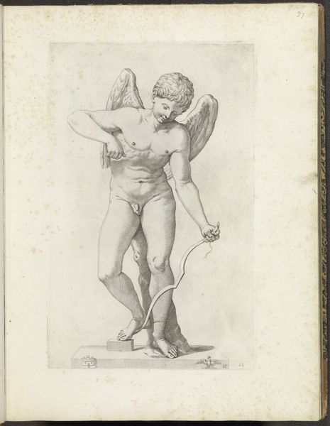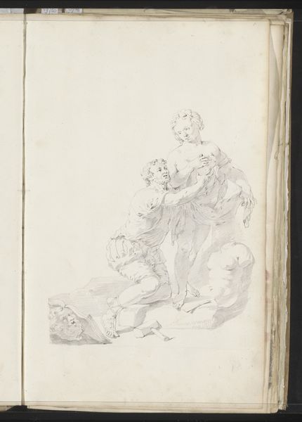 Editor: We’re looking at "Standbeeld van Diana," a pen and ink drawing from the 1630s or 40s by Giovanni Luigi Valesio. It’s a sketch of the goddess Diana standing with her hound. The figure and the marks are so light, yet they have such confidence and life! What do you see in this piece, what story do you read? Curator: What strikes me immediately is how Valesio uses the classical imagery of Diana, the huntress, as a container for cultural values of the time. She holds that fascinating weight! Notice how she’s both powerful, armed with her bow, yet also graceful and idealized. Editor: Yes, the contrast is definitely there. Is that dog wearing armour on its legs? It's unexpected. Curator: Indeed. The dog wearing greaves can be interpreted in a number of ways: referencing military or protective virtues projected onto loyalty, perhaps. What do *you* make of this specific element and the way the Diana figure doesn't necessarily acknowledge the animal itself? Editor: I didn't notice that disconnect, the animal’s gaze going ignored... Maybe that's meant to suggest a hierarchy even in a depiction of a deity who is about the natural world, right? Curator: Precisely! The composition emphasizes the control over, not communion with, the natural order. Furthermore, think of the Baroque period's fascination with allegory... Every detail, down to the very material and act of sketching is a form of knowing itself, and inviting knowledge. It suggests the viewer participates in understanding these complex symbols of virtue, divinity, and control. Editor: I guess it’s a lot more layered than just a pretty picture of a goddess with her dog! The allegorical dimension is so interesting and transforms how I appreciate the artist’s technique. Curator: And seeing it in that way lets you then project *your* understanding *into* this centuries-old symbol. A lovely thing, isn’t it?