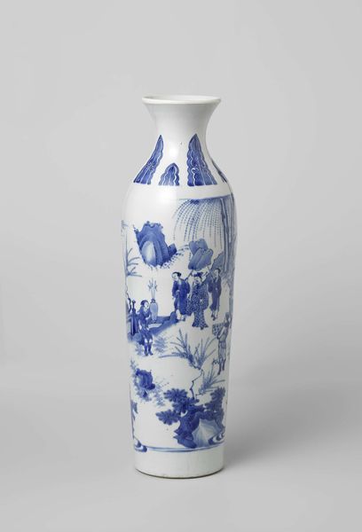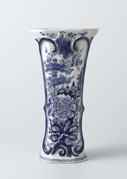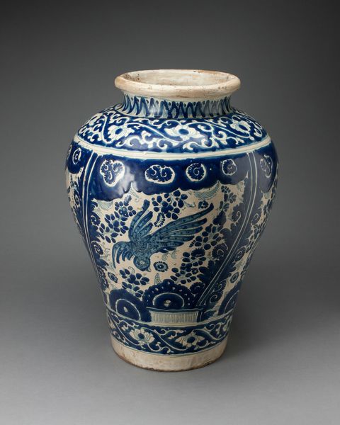 This ceramic pot was created by De Drie Posteleyne Astonne. The form is immediately striking: a rounded body that swells confidently, contrasted by a narrow neck. The pot is enveloped in a vibrant cobalt blue pattern of flora and fauna against a white ground. The design is dense, a tapestry of stylized flowers, leaves and birds that interact across the surface. Note the repetition and variation in the arrangement; each element echoes another, creating a cohesive visual rhythm. The linear quality of the painted details, combined with the overall symmetry, suggests an underlying structure guiding the composition. The pot’s design does not merely replicate nature; instead, it reimagines it through a cultural lens, reflecting a complex interplay between observation, convention, and artistic interpretation. The absence of a lid destabilizes the pot’s completeness. It prompts a re-evaluation of the vessel's function, moving beyond utility towards a more symbolic or decorative role. This tension between form and function underscores the object’s status as a carrier of meaning, inviting us to consider the cultural values and artistic traditions that have shaped its creation and reception.