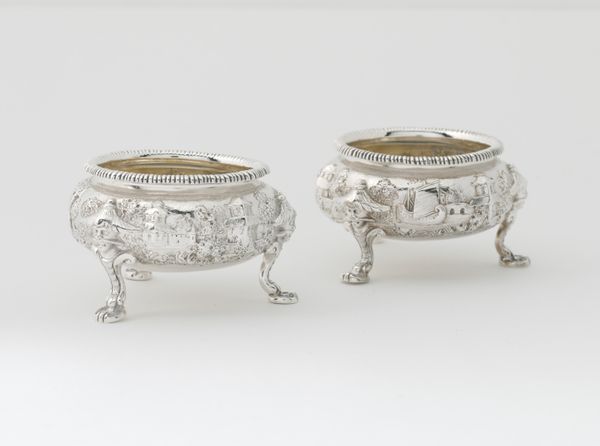 Curator: Ah, yes, these diminutive marvels—a pair of salt dishes crafted by David Hennell in 1751, currently residing here at The Art Institute of Chicago. Editor: My first impression is one of intricate balance; the weight and coldness of the silver is softened by those almost exuberant floral reliefs, it suggests luxury but also practical usefulness. Curator: Precisely. Hennell’s manipulation of the silver—consider the contrast between the smoothness of the bowls and the high-relief floral work. He's playing with textures, guiding the eye through the artwork with the language of touch. Semiotically, those blossoms don't merely decorate. Editor: And then there's labor—the countless hours that must have gone into chasing and embossing the silver to achieve that level of detail. Someone's daily work produced not only function, holding salt, but also social signal for owner. Curator: True, and don’t overlook the significance of pairing. The mirrored composition strengthens the notion of duality, mirroring perhaps wealth and refinement within domestic space. Editor: The Lion-paw feet add a robust element grounding the dishes and indicating power while being used. Curator: Note how the repetition and symmetry create a kind of dialogue. What could it have represented when situated in 18th-century home, perhaps reflecting the balanced hierarchies of the domestic table? Editor: Certainly—they reveal a very tangible link to dining practices of that time, and make visible the consumption habits of a particular privileged class. Luxury on this tiny scale seems both extravagant and rather pointed. Curator: These salt dishes offer not merely utilitarian function, but a subtle tableau. What they symbolize resides both in form and socio-historical content. Editor: Reflecting on their craftsmanship gives such depth of appreciation as someone in modern era appreciating craft and industry, especially regarding class differences. Curator: And for me, engaging in aesthetic analysis further elucidates design and semiotic density through their structural articulation.
