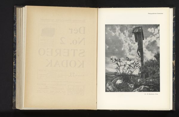 Curator: Let’s examine this open book featuring a portrait by Clarence Hudson White, taken before 1901. It presents a woman amongst the trees. I find it to be quite an arresting study in tonal values and the relationship between figure and ground. Editor: Yes, initially, my eye is drawn to the photographic reproduction nestled next to the aged paper of the adjacent page, suggesting this book and its materials possess as much importance as the images bound within. I wonder about its production; What paper was used and how does that influence meaning? Curator: I find the juxtaposition intentional. Note how the photographic process, which emphasizes precise details and tonal gradation, stands in contrast to the printed matter facing it. The typeface becomes an integral visual component of the overall aesthetic, not merely a conveyance of information. Editor: But doesn't this choice point toward a broader understanding of photographic processes during White’s era? The handwritten and historical font on the opposite page, seemingly reproduced or created through transfer, reminds us of the labour embedded in artmaking – photographic or not. I wonder if the choice to print in this manner was to make the artwork more handmade, challenging what constitutes as art, craft or industrial creation? Curator: Indeed. Furthermore, consider the visual rhyming: the soft-focus, evocative image of the woman mirrored on the aged paper through thick, faded letters creating type repetitions. Both offer forms of repetition that guide and support an understanding of the artwork. Editor: True. It underscores the intersection of nature and technology in White’s work, showing photographic skill as labor with social consequence: what messages can be circulated more easily through photographic means or artistic creation using unique methods. What audiences could this work engage at the time of its publication? Curator: Precisely. I hadn't thought about White’s broader influence beyond strictly photography! It's so interesting how a photograph placed next to distinct materiality can shape our thinking. Editor: And for me, reflecting on labor and materials lets me explore what White and his contemporaries tried to tell a late 19th/early 20th-century audience.