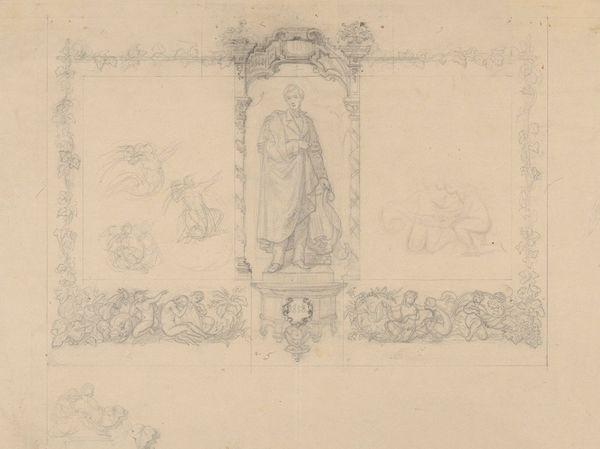 Curator: Here we have a design study rendered in pencil: Jean-Jacques Feuchère’s “Ontwerp voor kandelaber,” dating from around 1830 to 1840. Editor: The delicacy of the line work gives this drawing an almost ethereal quality. It certainly whispers elegance and refinement, wouldn't you agree? Curator: Undoubtedly. Feuchère clearly prioritizes clarity of form. The composition hinges on balance and symmetry, reflecting a Neoclassical sensibility, don't you think? Note how each element—the candelabra, the statue above the clock, the vase—demonstrates an equilibrium in design. Editor: Absolutely, but I read that sense of equilibrium as symptomatic of a period obsessed with control and order following the French Revolution. These objects would have adorned spaces that reflected the power and privilege of the elite, a visual language of authority if you will. The candelabra isn’t just a source of light, it is a symbol of luxury and status. Curator: Of course. It's a demonstration of artistic mastery—look at the precise rendering of details and classical motifs throughout, with that commitment to geometric purity so characteristic of the period. Semiotically, it reinforces values of beauty and permanence, don't you think? Editor: I agree it's carefully and classically composed, but it also communicates more complex and exclusionary ideologies. Neoclassical aesthetics became intertwined with ideas of national identity, projecting an image of refinement often used to justify class structures, wouldn’t you say? It's vital to recognize how aesthetic choices play into socio-political realities, and even inequalities. Curator: The discussion highlights, if nothing else, how diverse approaches reveal nuanced readings in a relatively unassuming drawing, wouldn't you agree? Editor: Indeed. Hopefully our discussion provided multiple frames with which to understand the design and context behind it.