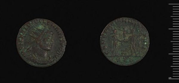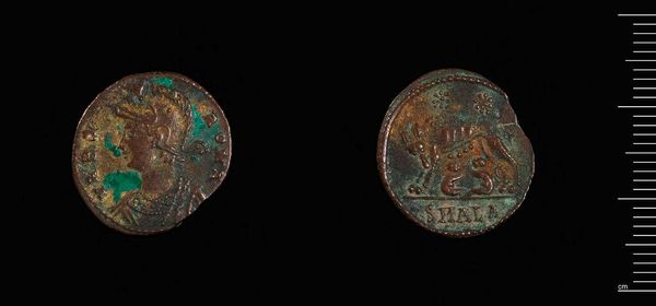 Curator: Here we have what's known as a Fraction of Maximian, Cyzicus, credited to Maximianus I Herculius. It's part of the Harvard Art Museums collection. Editor: It feels like gazing into a tarnished mirror reflecting a ghost of the past. The green patina whispers stories of age and forgotten empires. Curator: Indeed. The corrosion, from a formalist viewpoint, enhances the surface texture, creating an almost pointillist effect across the emperor's profile. Notice how the raised relief catches the light. Editor: Absolutely, though it also obscures details, lending a sense of mystery. I wonder what hands this coin passed through. What bargains were struck, what dreams were chased? Curator: One can only speculate. Yet, the coin remains a potent symbol, a testament to power and enduring materiality despite its diminutive size. Editor: Exactly. It's a humbling reminder that even empires fade. It gives you the feeling that you are holding history. Curator: A fitting synthesis of aesthetic form and historical significance, wouldn't you agree? Editor: I’d say that’s pretty accurate. A great synthesis.