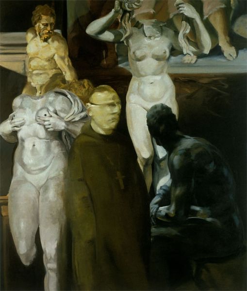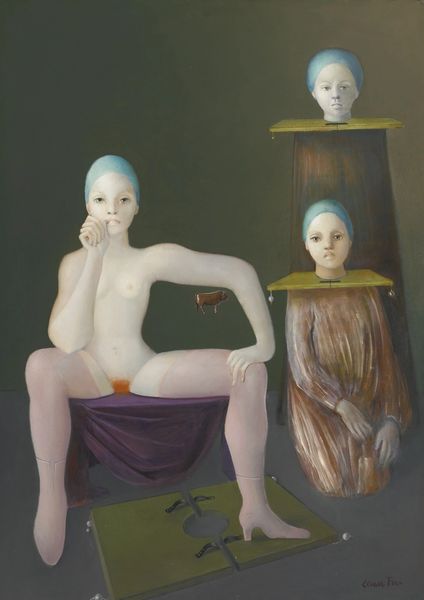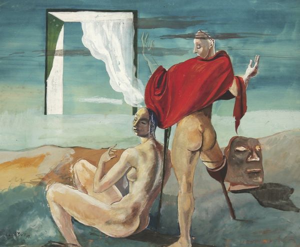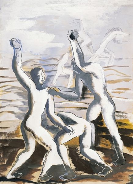 Editor: This is "El Cainismo" by Manuel Rodríguez Lozano, painted in 1947 using oil paints. I’m immediately struck by the figures’ muted color palette and how it contributes to the unsettling atmosphere. The inverted figure definitely disrupts the composition too. What do you see in this piece from a formalist perspective? Curator: Precisely, the restrained palette consisting of blues, greens, and grays is key to the artwork’s success. Note how the figures’ skin tones blend seamlessly into the somber background, enhancing the symbolic death in a Cain and Abel-inspired painting. Consider, also, the stark contrasts. Do you observe how the smooth planes of the figures play against the rougher texture of the implied landscape? Editor: Yes, I see that now! The contrast creates a real tension. Is the interplay between the smooth figures and the rough ground meant to evoke particular emotional or psychological responses? Curator: In a Formalist reading, consider instead the dialogue it establishes within the image itself. How do the lines of the prone figure interact with those of the standing one? Note the almost geometric division of space. These are the visual relationships that articulate the painting's inherent meaning. Lozano's construction speaks to the underlying dynamics, without needing recourse to external symbolism. Editor: I hadn't considered it solely as a relationship between lines and planes, how the figures mirror or oppose each other through their shapes. Curator: Exactly! We move beyond simplistic symbolic readings and perceive how form generates the expressive power. Editor: I understand now. By concentrating on the painting's formal components, we uncover how the composition evokes narrative even through abstraction. Thank you for pointing out those relationships, I hadn’t spotted that previously.