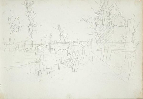 Curator: This delicate pencil sketch, currently untitled, is by Joshua Cristall, who lived from 1765 to 1847. It is held in the Tate Collections and measures 94 by 155 millimetres. Editor: Mmm, very faint! It gives me the feeling of something half-remembered or just glimpsed out of the corner of my eye. Like a dream fading as you wake up. Curator: Cristall was known for his watercolour landscapes, often depicting scenes of rural life and coastal views. This sketch offers a glimpse into his process, capturing a scene, perhaps for a larger composition later on. Editor: I see a fortress, or perhaps a fortified harbor wall, and figures in the foreground. It's interesting how the fence-like structure blurs the line between what's enclosed and what's exposed. A little ominous, don't you think? Curator: Certainly, these structures symbolize power and protection, important concepts in British history, particularly maritime power. Editor: It's more fleeting for me, like the artist was trying to catch the vibe of a place rather than its perfect likeness. Curator: Perhaps he succeeded. It makes you wonder about the people, the place, the moment. Editor: Yes. It’s amazing what so little can suggest.