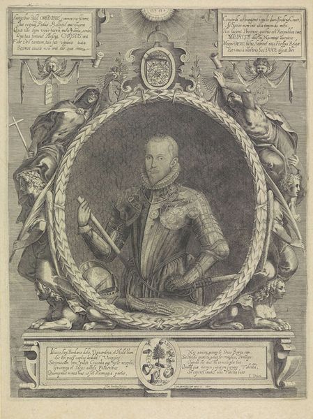 Editor: Here we have "Portret van Gottfried Ludwig Mencken," an engraving dating from sometime between 1762 and 1791, currently housed at the Rijksmuseum. The formality of the pose and elaborate framing give it a sense of officialdom, don’t you think? What stands out to you in this piece? Curator: Indeed. What's particularly fascinating about this portrait is how it functions as a visual assertion of power and social standing in the late 18th century. Engravings, due to their reproducibility, allowed for wider dissemination of such images, extending the reach of Mencken's influence beyond his immediate circle. What do you notice about the inclusion of text and emblems within the image itself? Editor: I see his name and some titles, almost like a resume. It feels like a very deliberate construction of an identity. Curator: Precisely! The inscription serves to publicly proclaim his accomplishments and solidify his place within the academic and social hierarchy. The inclusion of the crest reinforces his lineage and status. Consider also how the framing—the ornate border and drapery—further elevates Mencken, positioning him as a figure of considerable importance. Editor: So, it's less about capturing his likeness and more about broadcasting his achievements and status? Curator: To a degree, yes. Portraiture during this period was frequently commissioned as a tool for self-promotion. The subject actively participated in constructing a public persona that reinforced their desired image and societal role. Editor: That makes me think about how portraits function today, especially with social media. Maybe it’s not so different! Curator: That's an astute observation. The underlying motivations may be more aligned than we initially assume. Thinking about it this way provides a powerful lens through which we can look at not only past art practices but contemporary ones, too.