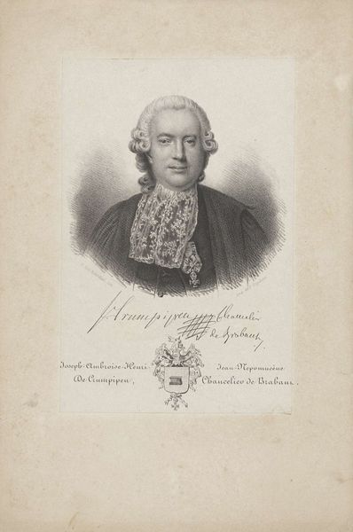 Editor: Here we have a portrait, entitled "Portret van Henri Herman Werner Francois Antoine de Crumpipen," dating from 1830 to 1840, by H. van Boterdael. It appears to be an engraving. It strikes me as quite formal, almost austere, even with its delicate lines. What do you see in this piece that I might be missing? Curator: What I see is a study in restraint. Look at the tight lines of the engraving, almost as if the artist was afraid to breathe too heavily onto the plate. And consider the sitter: so proper, powdered wig perfectly coiffed, that tiny medal... he seems a man very concerned with appearances, doesn't he? Though perhaps, and this is just a wild thought, perhaps that's exactly what Boterdael wanted us to think. Portraits are never really about perfect likeness, are they? More like carefully constructed fictions. What do you think this portrait tells us about ideas about masculinity and power at the time? Editor: Well, I hadn't considered it in that light, but I suppose that level of detail and formality speak to a desire to project authority, or at least a certain image of oneself. I do think that perhaps you are right. I assumed this was an accurate likeness! Curator: Remember, we can never truly know. It's a fun thought experiment, right? Maybe the gentleman was a riot. Editor: It really is. Now, I can't unsee this portrayal as anything but intentional and crafted. Curator: And that's the joy of art, isn't it? One little crack, and the whole thing looks different.