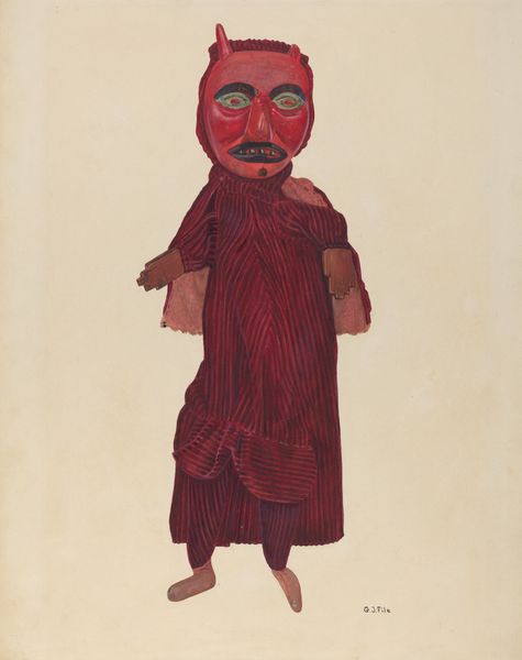 Florian Rokita created this "Punch" Clown Puppet drawing in the 20th century. The drawing presents us with a figure that immediately strikes a discordant note, a puppet rendered with precise lines, yet imbued with an unsettling vitality. The head, a dark ovoid form, is starkly contrasted by the vivid red cheeks and lips, drawing our eye to the performative mask of the clown. This mask both conceals and reveals, hinting at the tensions between appearance and reality. Rokita's use of line and form, combined with the puppet's rigid posture, evokes a sense of confinement. The floral patterns of the vest clash with the drab, shapeless skirt, creating a visual dissonance that underscores the artifice of the puppet's existence. Ultimately, Rokita’s "Punch" Clown Puppet pushes us to consider the complex ways in which cultural symbols and artistic forms intersect.